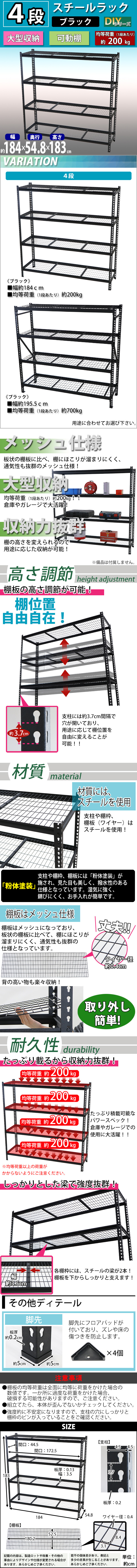 | 商品名 | 送料無料 4段 スチールラック 大型 ワイヤーシェルフ ブラック ボルトレス 粉体塗装 約幅184×奥行54.8×高さ183cm 高さ調節 スチール棚 スチールシェルフ オープンラック ワイヤー 業務用 収納ラック 収納棚 工具棚 ガレージ 収納 スチール 棚 ラック 黒 4stlrsr41bk |