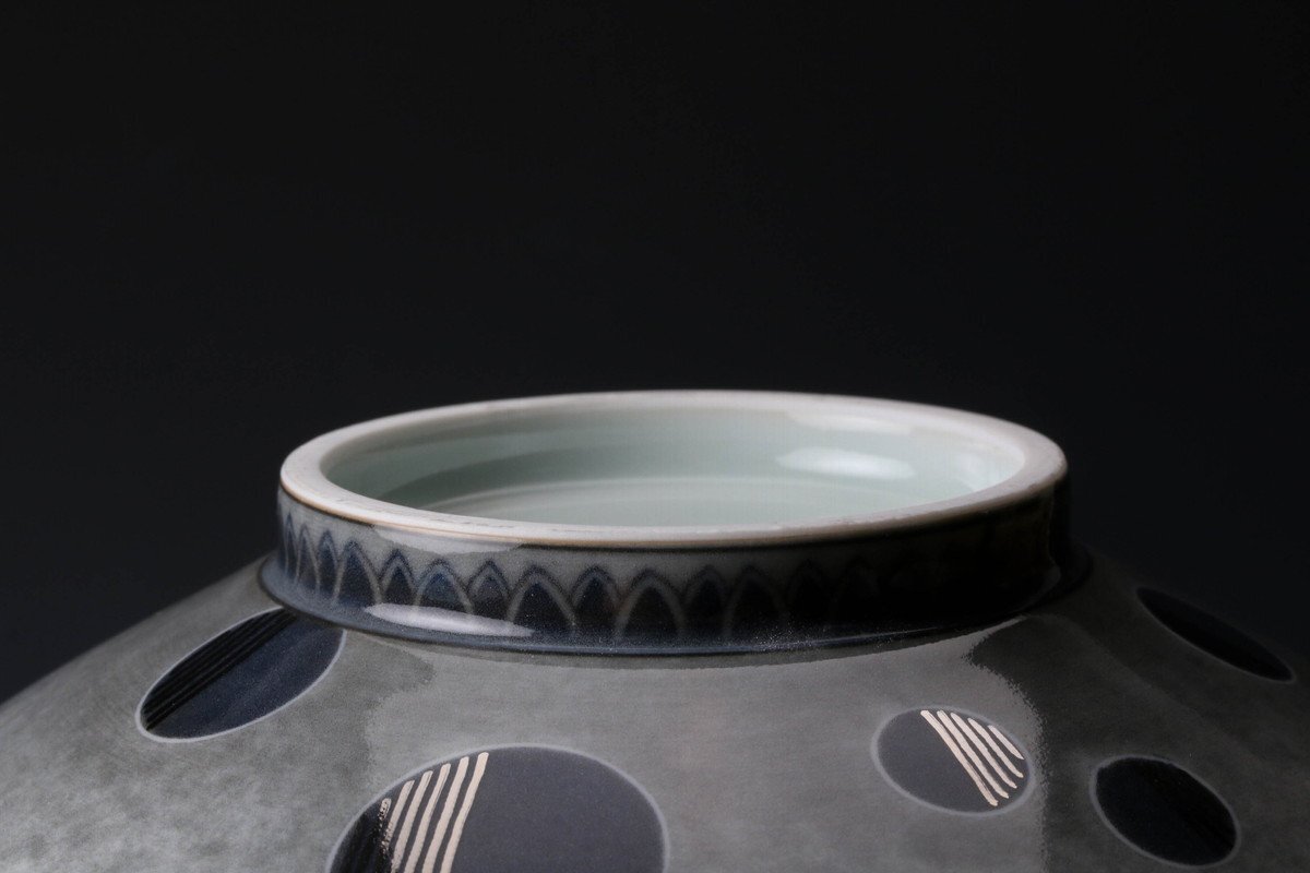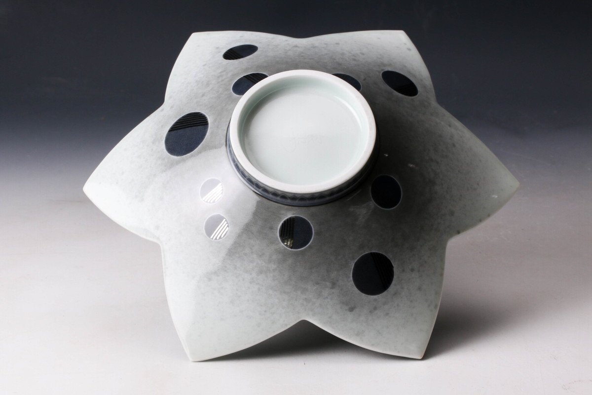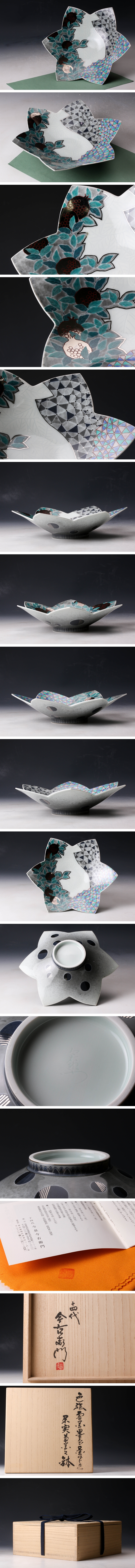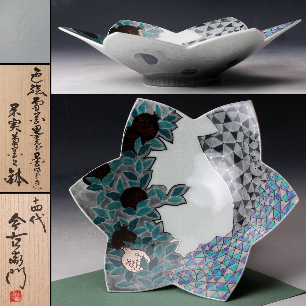 【佳香】人間国宝 十四代 今泉今右衛門 本人作 色絵雪花墨色墨はじき果実草花文鉢 共箱 共布 栞 本物保証