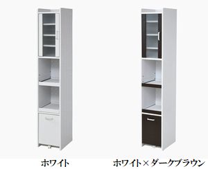 | 隙間タイプでスリム設計のキッチン収納。 高さ違い3タイプのシリーズ。 高さ180タイプは、ファミリーでの使用に適したフルサイズです。 家電が収納できるスライドテーブル2つに加えて、食器類の収納に便利な扉収納付きです。 扉の開く向きはお好みで設定可能です。 ペットボトルも収納可能な深めの引出しもあります。 |