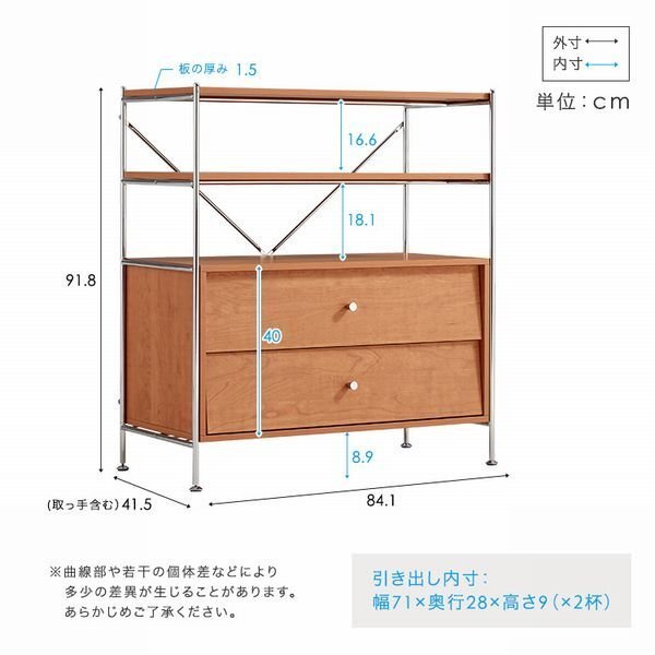 | 引出し収納付きシェルフラック! ステンレスとナチュラルな木目の組み合わせがスタイリッシュで、お部屋の雰囲気をおしゃれに引き上げてくれます。 大容量の引き出しが2個付いているので、収納力もばっちりです。 |