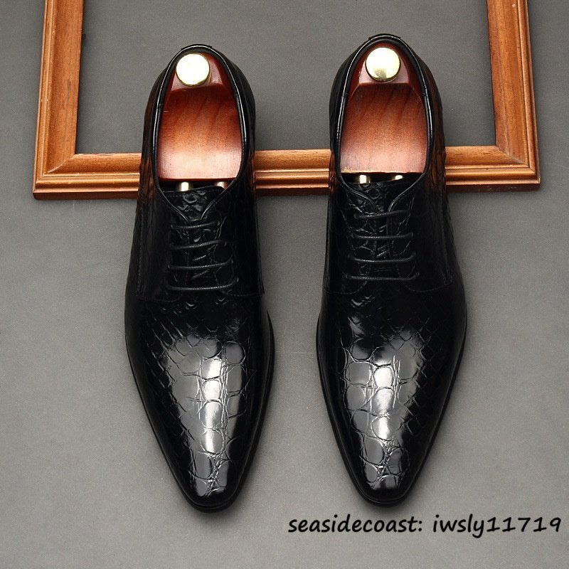 定価10万超★最高級 メンズ ビジネスシューズ 鰐柄 本革 レザーシューズ 牛革 イギリス風 職人手作り 紳士靴 革靴 結婚式 ブラック 27.5cm