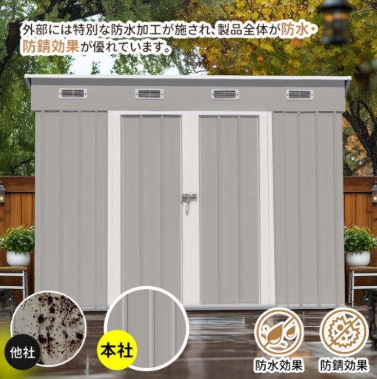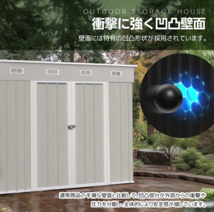 【国内発送】物置 屋外 スチール 倉庫 床材補強フレーム付き 戸外収納庫 幅270*奥行き126*高189 物置き おしゃれ 大型 収納庫 屋外物置