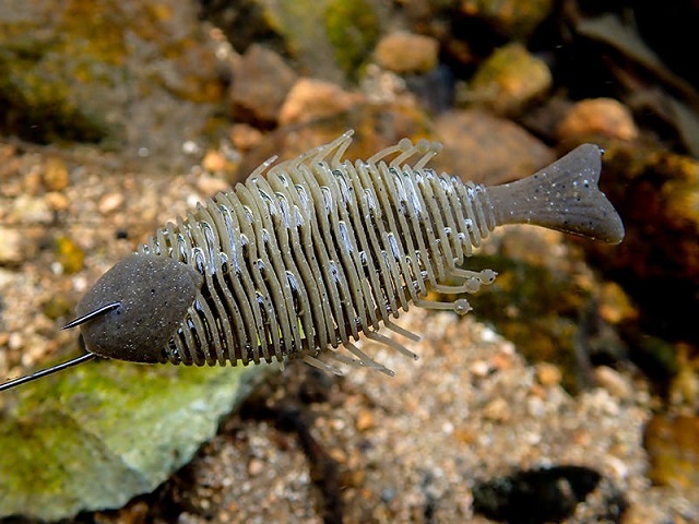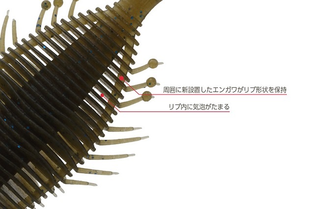 外周をやんわりとエンガワで補強することでリブの乱れを解消。リブ内に空気を保持しやすくなり、アクションさせると気泡がボディから離脱するため、動きの変化と浮き上がる気泡でバスに存在をアピールします。エンガワはルアー全体の水押しを強める役割を果たすだけでなく、ライブソナーにも映りやすくなるという副産物もありました。
