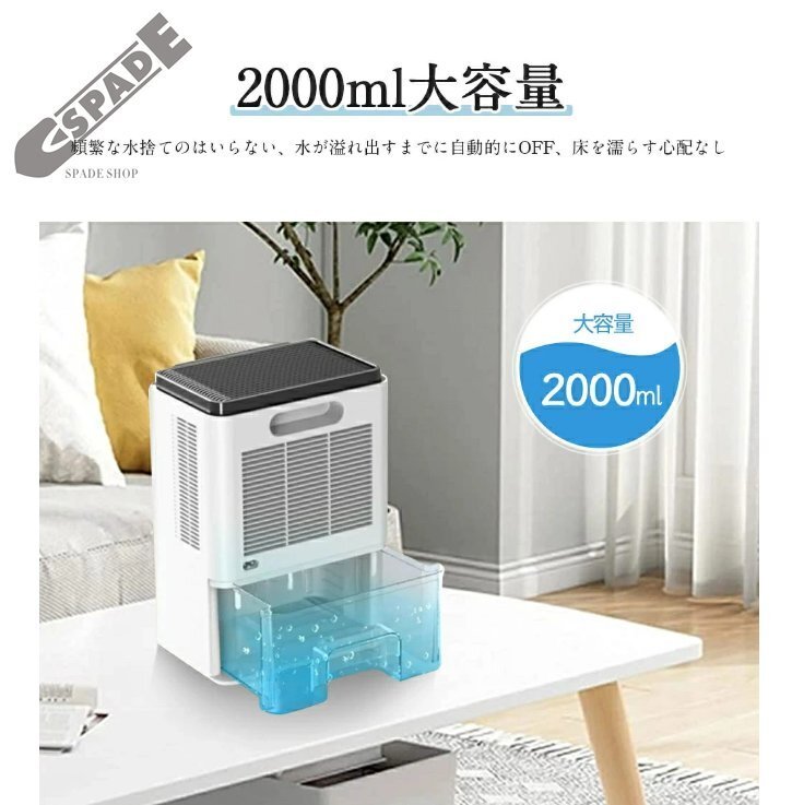 | コンパクトで除湿機 ・ 狭所向け | ・上下分離式構造で、通常よりコンパクトサイズに軽量タイプなので、持ち運びも水捨ても楽々な小型除湿器です。卓上置き、床置きだけでなく、玄関、クローゼット、押入れ、下駄箱、脱衣所、キッチン、浴室、子供部屋、ガレージなど狭い空間の除湿にぴったり、複数の部屋での使いまわしも便利で、一人暮らしでも場所取らずに使えます。 2L大容量透明タンクで毎回の除湿量が一目瞭然! |