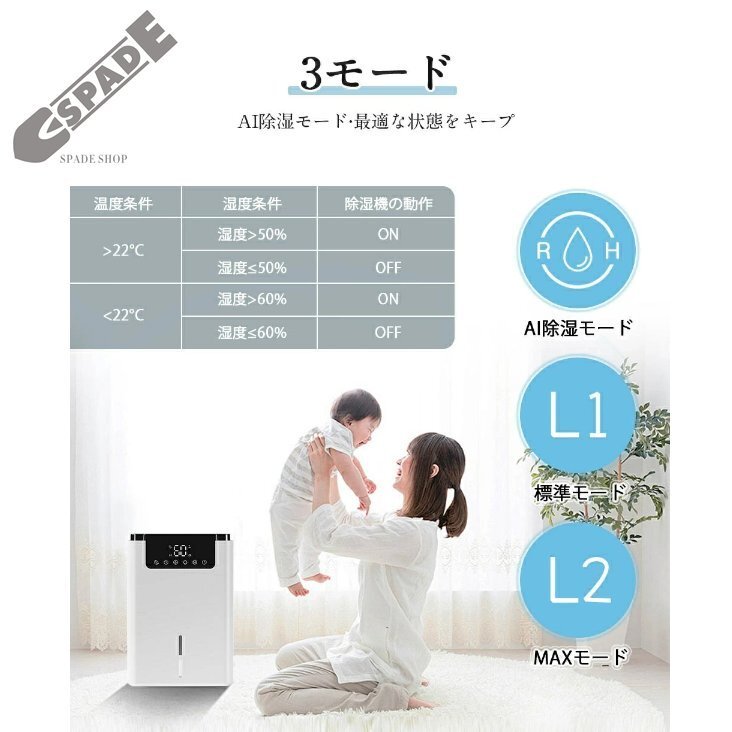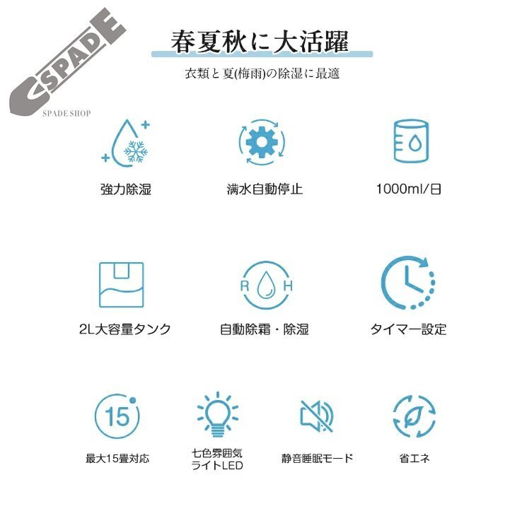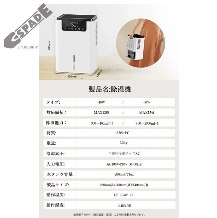 | 商品詳細 | ・サイズ(約):280*200*140mm ・重量(約):2.3KG ・定格消費電力:40w/60w ・空焚き防止、満水提示 ・除湿方式:半導体 ・除湿能力:1000ML/D(※環境温度30℃/湿度90%) ・適用面積:0-15畳 ・推奨使用環境:温度15~40℃、湿度45~90% ・タンク容量:約2L ・動作音:30dB以下 ・保証期間:2年間 |