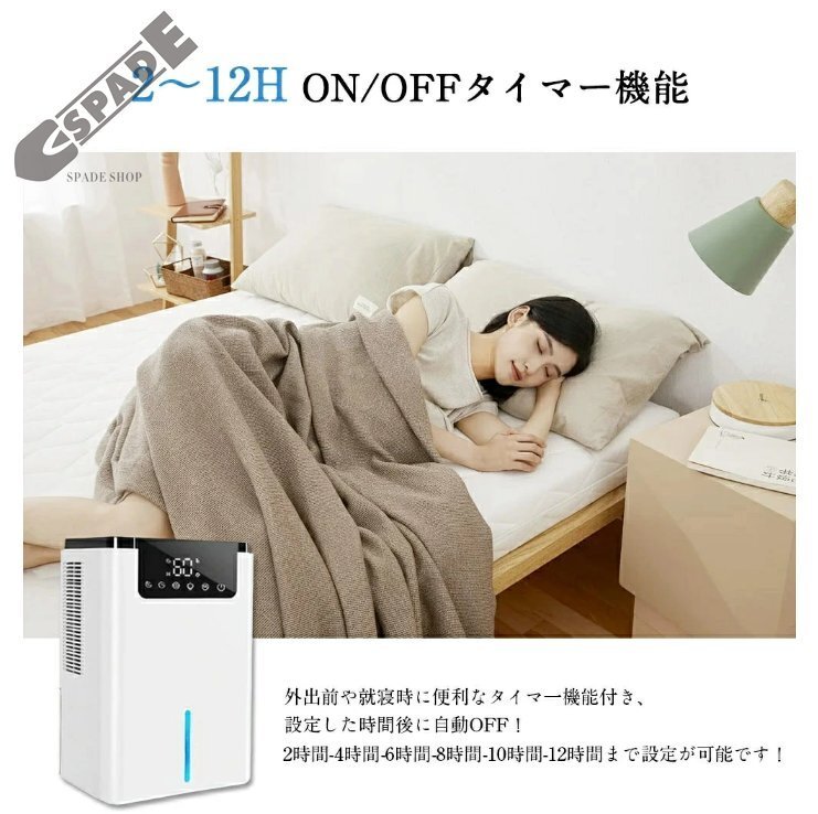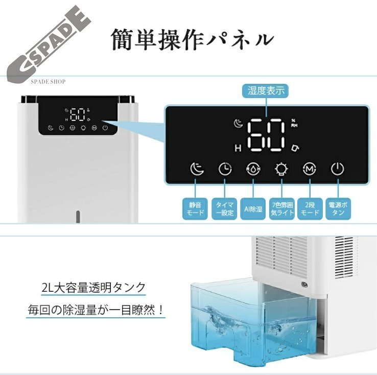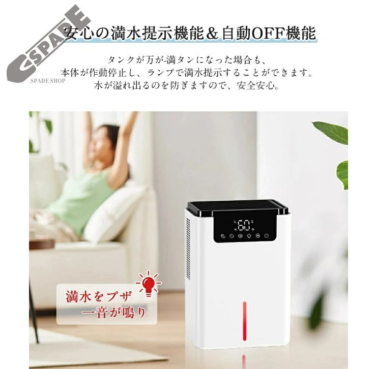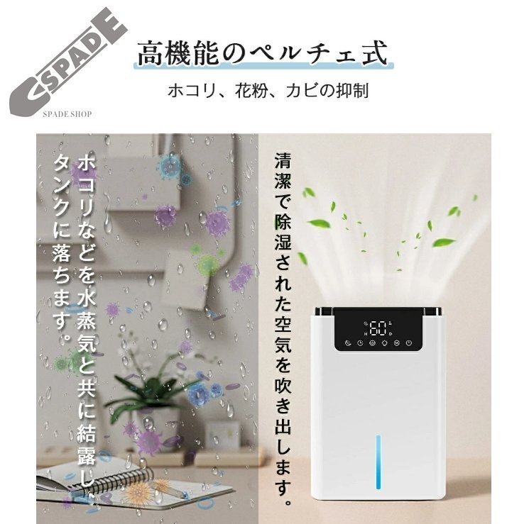 | 除湿力抜群・革新的な半導体技術 ・2Lの大容量 | ・湿気に敏感なペルチェ式といわれる半導体式が採用されて、アップグレード吸気口、一日あたりの除湿量はなんと600mlです!(80%RH、室温30℃の環境条件でテスト)ダニ・結露・異臭・カビなど湿気によるいろんな悩みを一気に解決します。心地の良いさらさらとした快適空間を作り出してくれます。夏の梅雨対策にも、冬の部屋乾燥にも、いやな湿気をパワフル除去し、抜群な除湿力で一年中に室内環境を快適に!除湿機は2L大容量透明タンク付き、毎回の除湿量が一目瞭然!2.2L大容量で頻繁に水を捨てる手間がかかりません。注意:アダプタをゆるめないようにしっかりと差し込んでください。 |