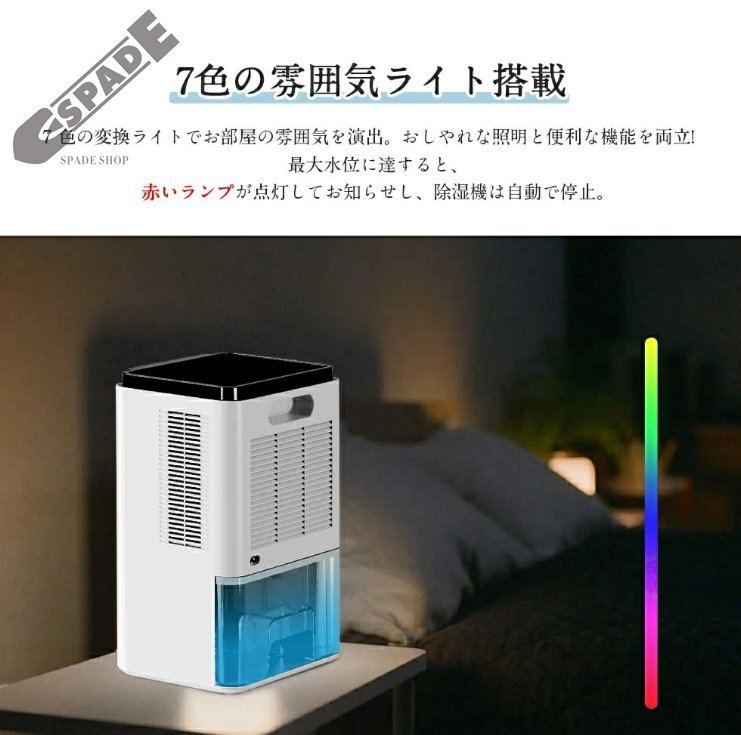 | 静音作業 ・ 超省エネ・7色の雰囲気ライト | ・運転音は35dB以下なので眠りを妨げずに寝室や子ども部屋でも安心してお使いいただけます。圧倒的な静音仕様で運転中はほぼ無音運転で、睡眠、仕事、読書を妨げず、夜の部屋干し、オフィスや図書館での除湿用にも使えます。消費電力わずか40W、1時間あたりの電気代は約1円!経済的で省エネな除湿機。通常の除湿機よりずっと省エネで、一日つけっぱなしでも大丈夫です。除湿機操作部のライトボタンを押すと、7色の雰囲気ライトが切り替えできます。 |