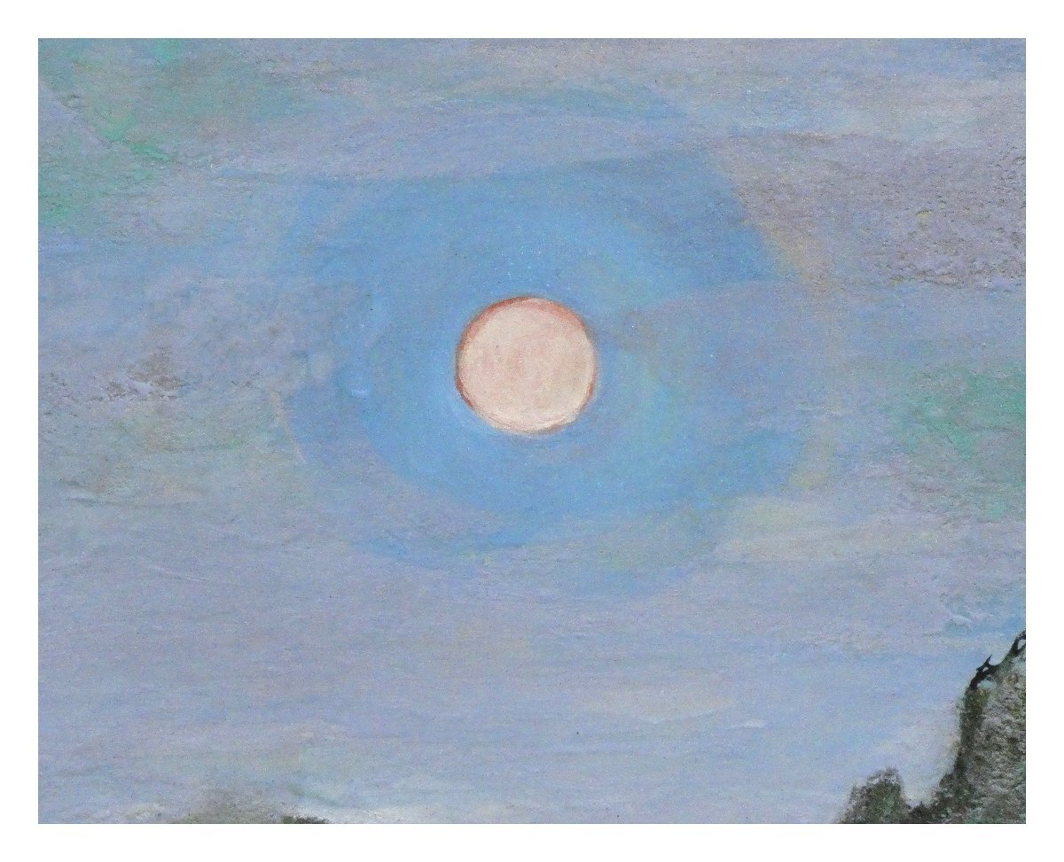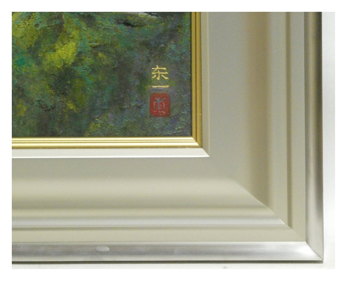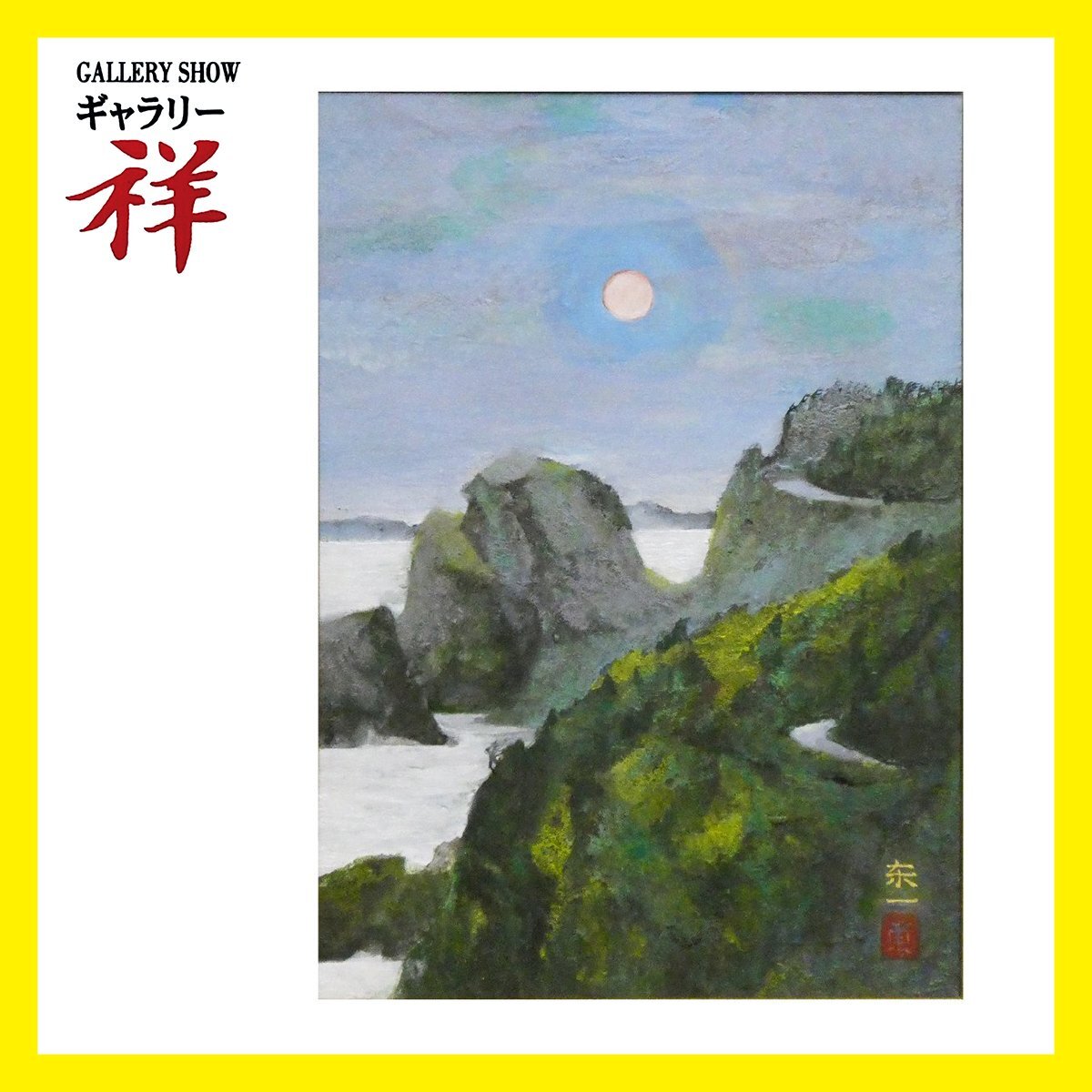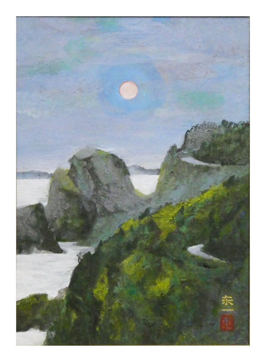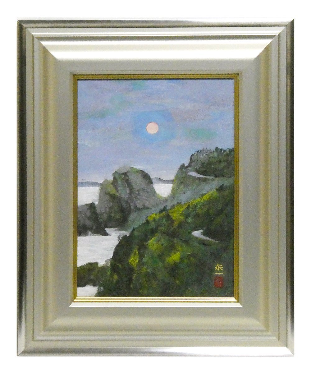 日本画家・加藤栄三画伯を兄に持つ加藤東一画伯。 代表作に「鵜飼」「漁火」などがあり、灯る光の表現と幻想的な作風が特徴的です。 南紀の海・厳かな朝焼けの風景を描いた作品です。 自然の険しさを物語る岩々の間から昇る太陽。 陽光に照らされた幻想的な世界観に引き込まれます。 |