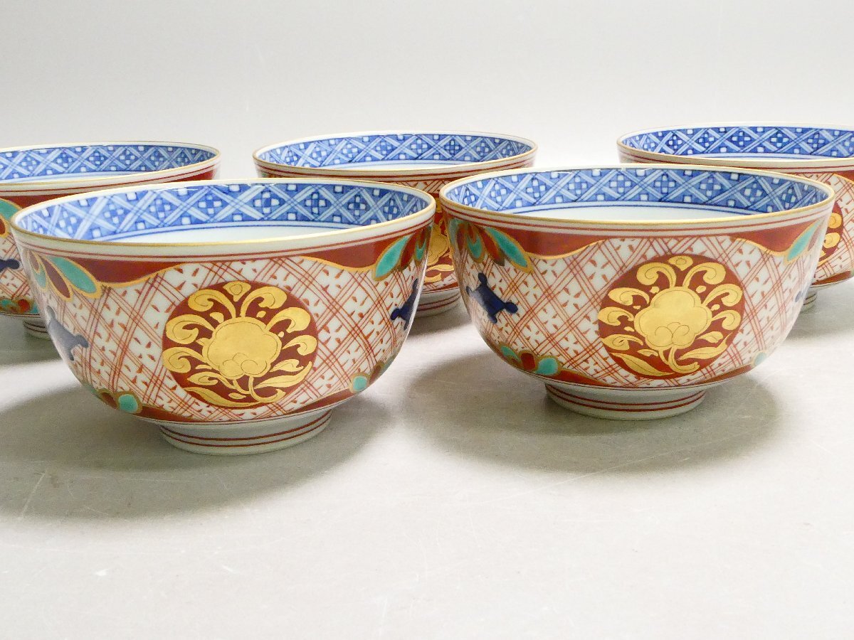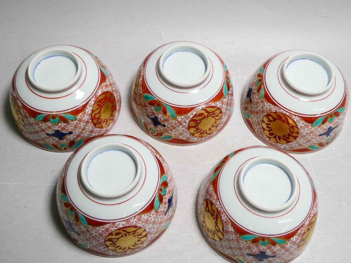 110439 京焼 清水焼 平安禎山 赤絵金彩七宝文 飯茶碗 五客 懐石道具