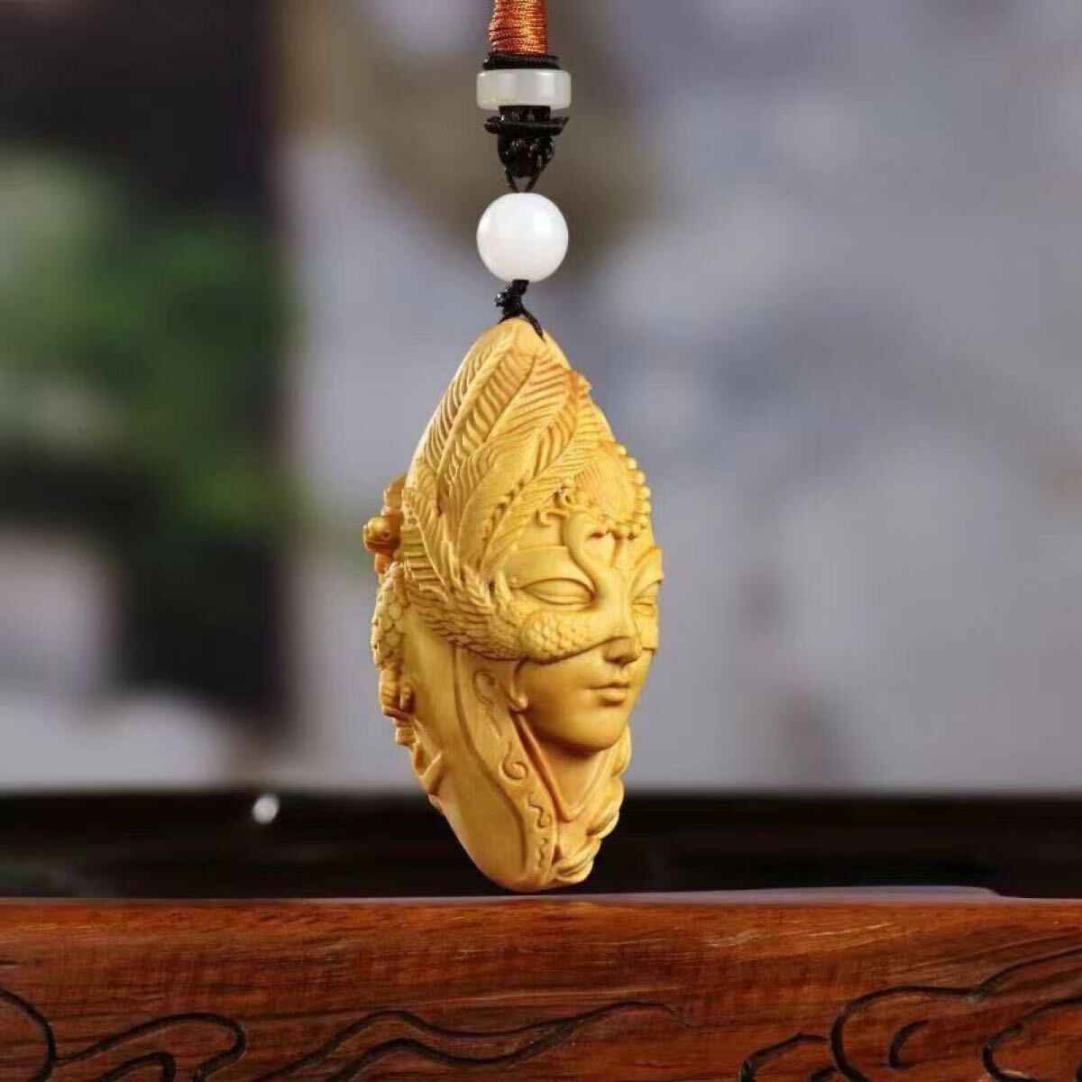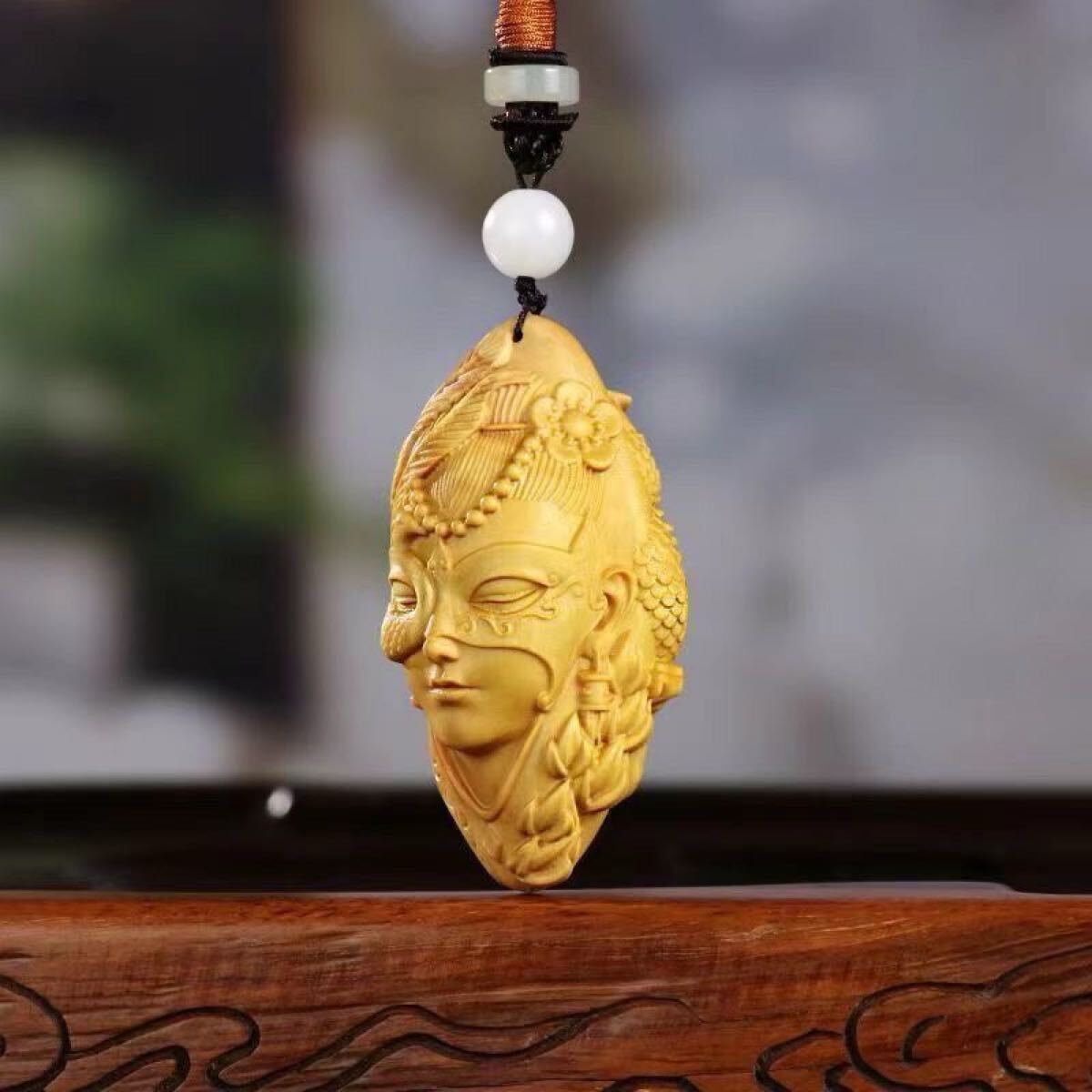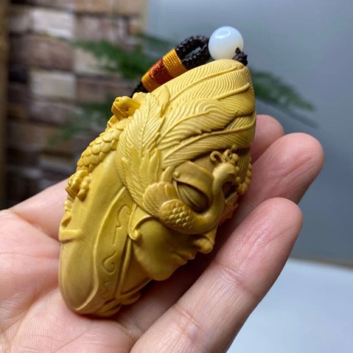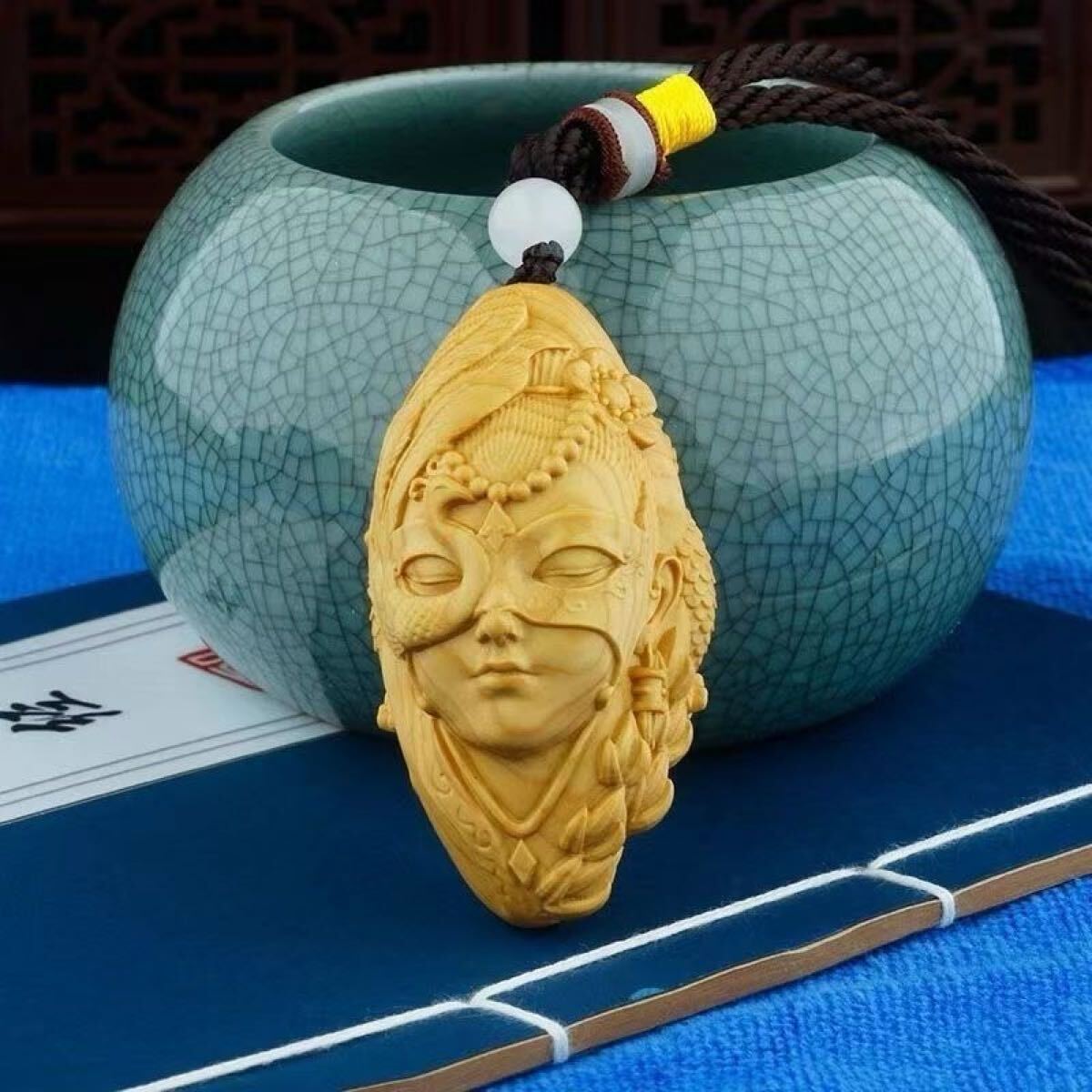仏教美術 新作 高級柘植木彫 大唐美人 天然木製ハンドメイド/細工彫刻 プレゼント/開運風水厄除け 根付 高さ6cm ストラップ付き 美品