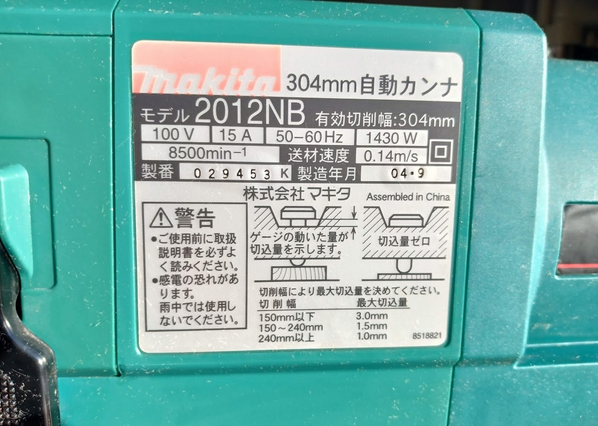 | 【佐川160サイズ】中古 makita マキタ 電動かんな 自動カンナ 2012NB 最大切削幅 304mm フード付き | |