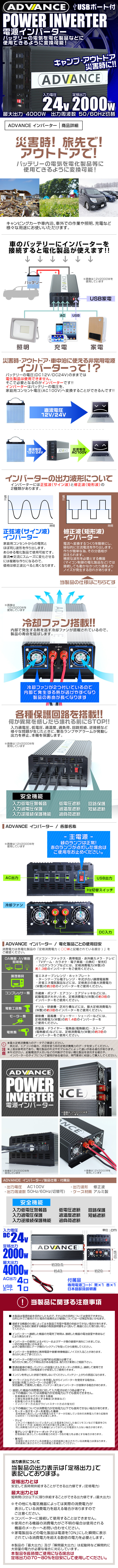 バッテリーの直流24Vを交流100Vに変換! コンセント4個付で同時に4台の電化製品が使用可能! ※車などで使用しているバッテリ → 直流電源 家庭用のコンセント → 交流電源 野外のコンセントが無い所でも、インバーターがあれば家電が使えます。 また、緊急時や災害時などにも大活躍!! 【商品仕様】 ・寸法:410mm(L)×220mm(W)×80mm(H) ・AC100Vコンセント ×4 ・入力電圧:DC24V ・出力電圧:AC100V ・定格出力:2000w ・最大出力:4000w ・出力周波数:スイッチで50Hz/60Hz 変換可能 ・出力波形:矩形波(疑似正弦波) ・ケース:アルミ製 【商品機能】 ・回路保護 ・入力低電圧警報音 ・低電圧遮断 ・過温度遮断 ・過負荷遮断 ・短絡遮断 ・入力過電圧保護 ・入力逆接続保護機能 【商品内容】 ・インバーター本体 × 1 ・電源コード × 2 |