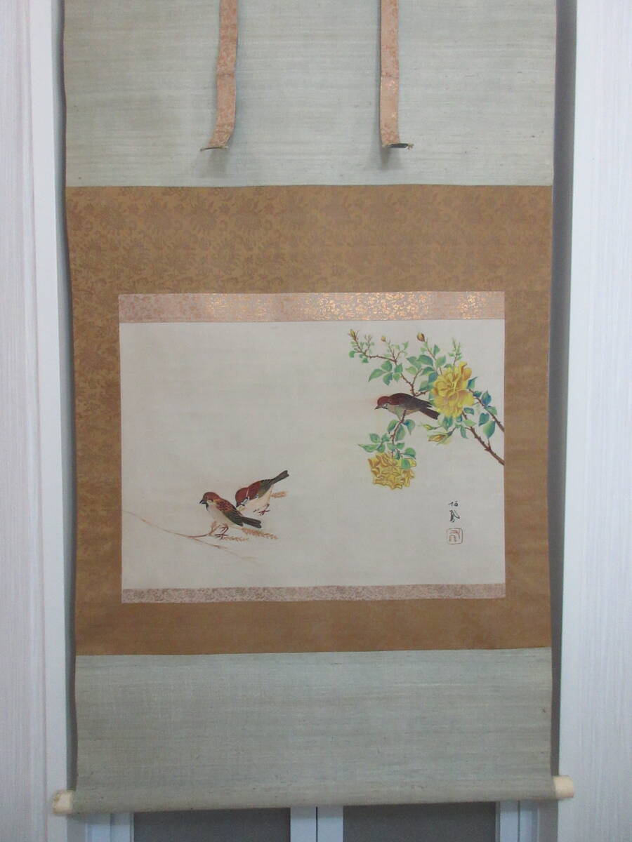 【真作】/ 竹内栖鳳 絹本「雀之図」 肉筆 花鳥図掛軸 / サイン・落款 合箱 / 検索 ( 近代日本画巨匠 横山大観 文化勲章)