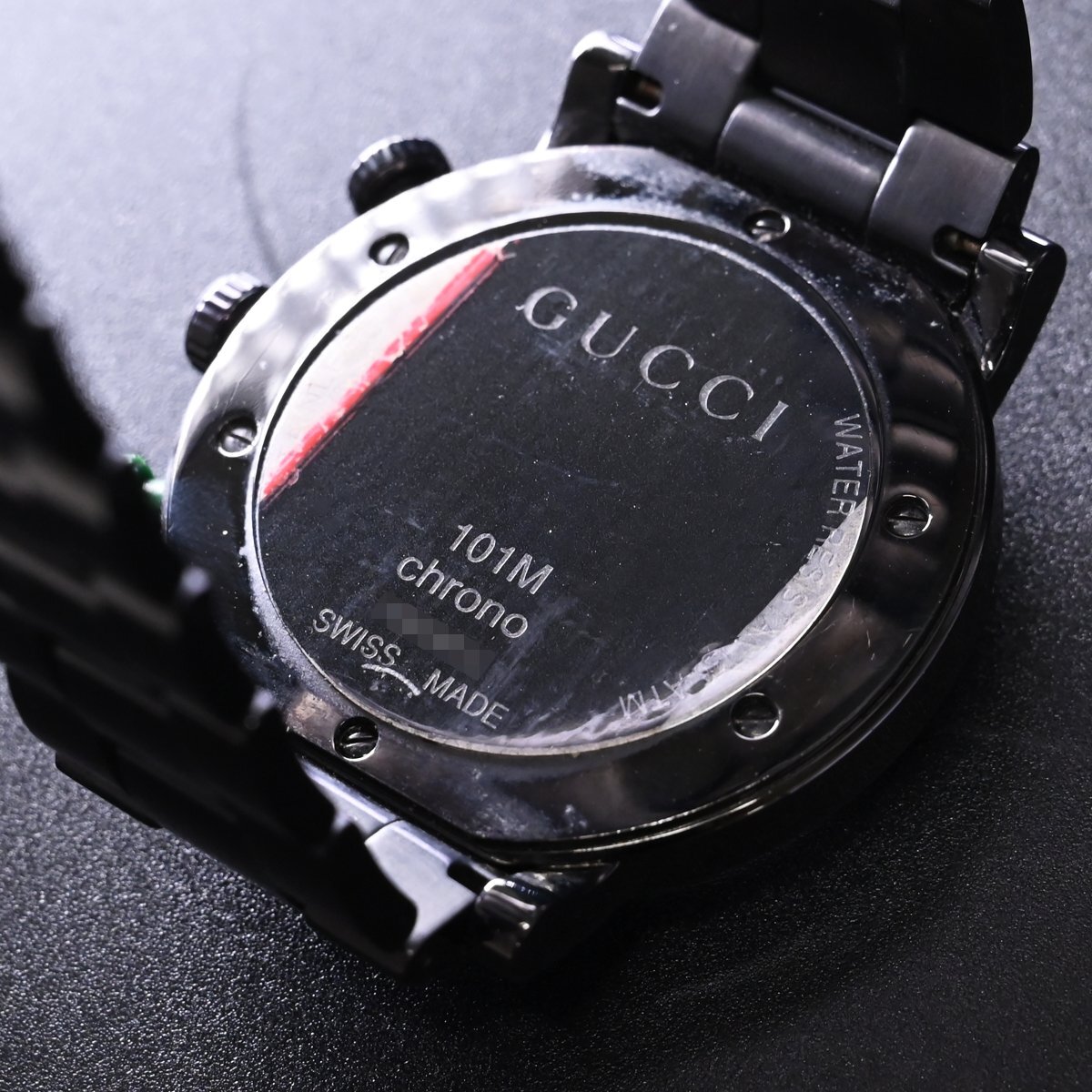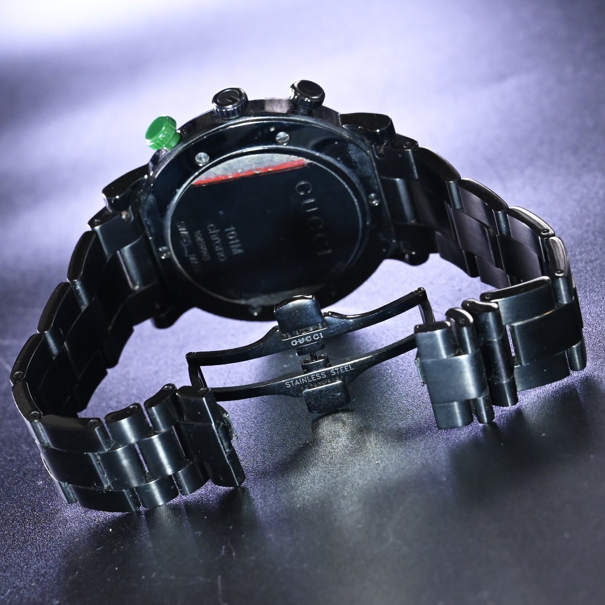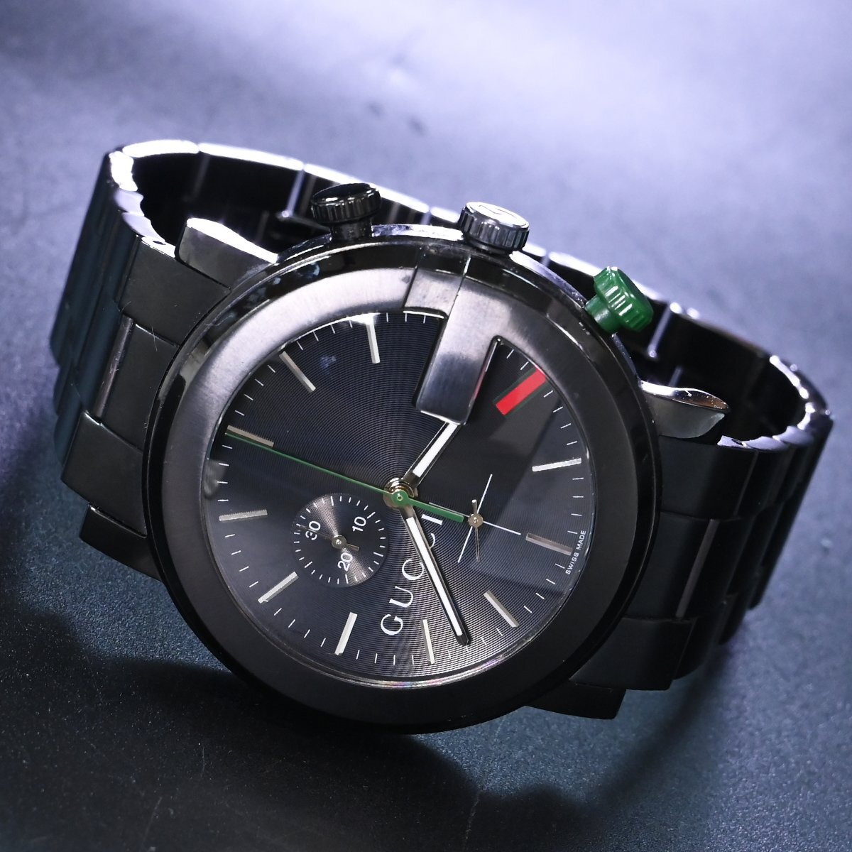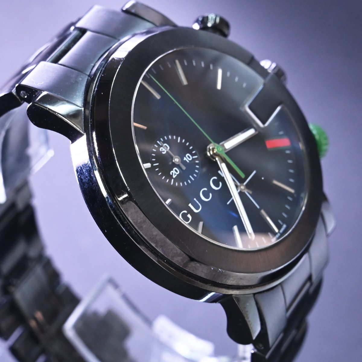グッチのGクロノグラフ ウェブポイント オールブラックです。 メゾンのアイコンGをケースデザインに落とし込んだアイコニックな逸品。 漆黒のブラックにウェブラインがアクセントになっています。 ※基本動作確認済。 |