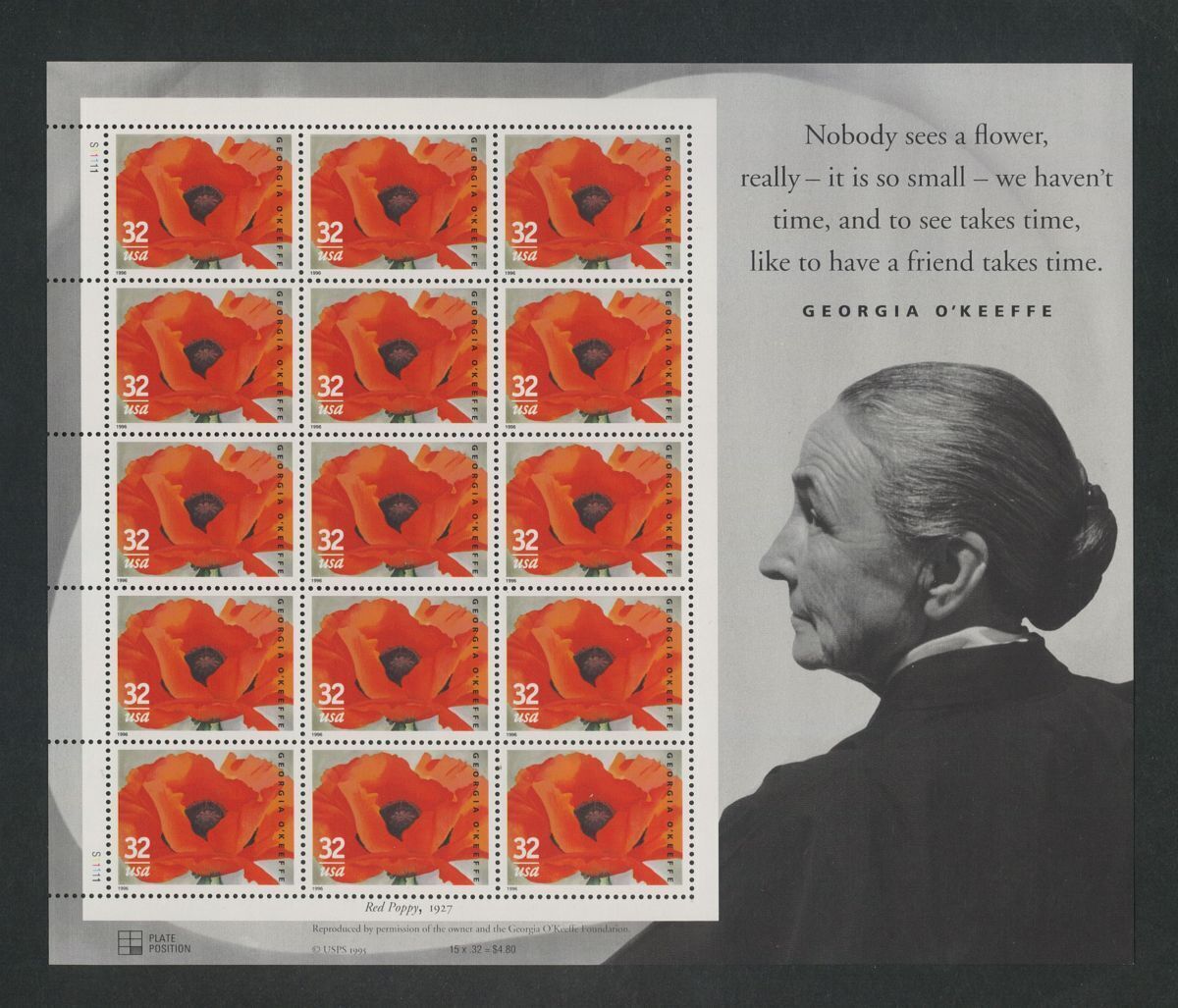 外国切手 アメリカ 花 赤いポピー1927年 ジョージア・オキーフ(20世紀のアメリカを代表する花の画家)15面シート 未使用