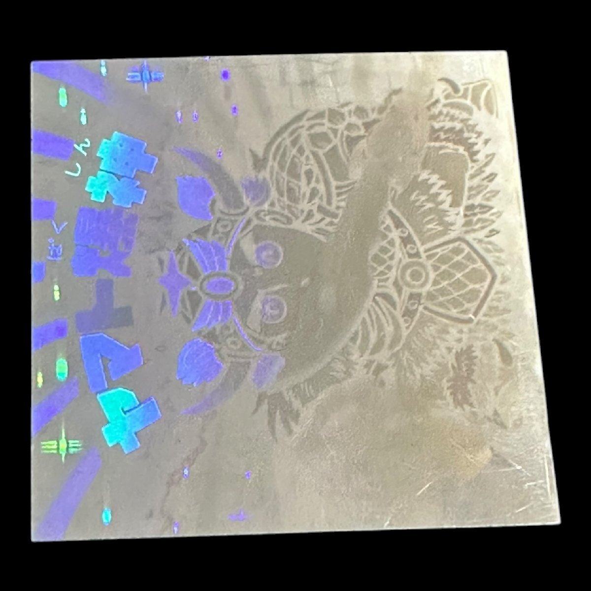 表面は銀地のホログラム仕様で、見る角度によりキャラクターの光彩や背景の放射エフェクトが虹色に変化します。