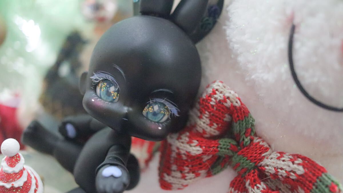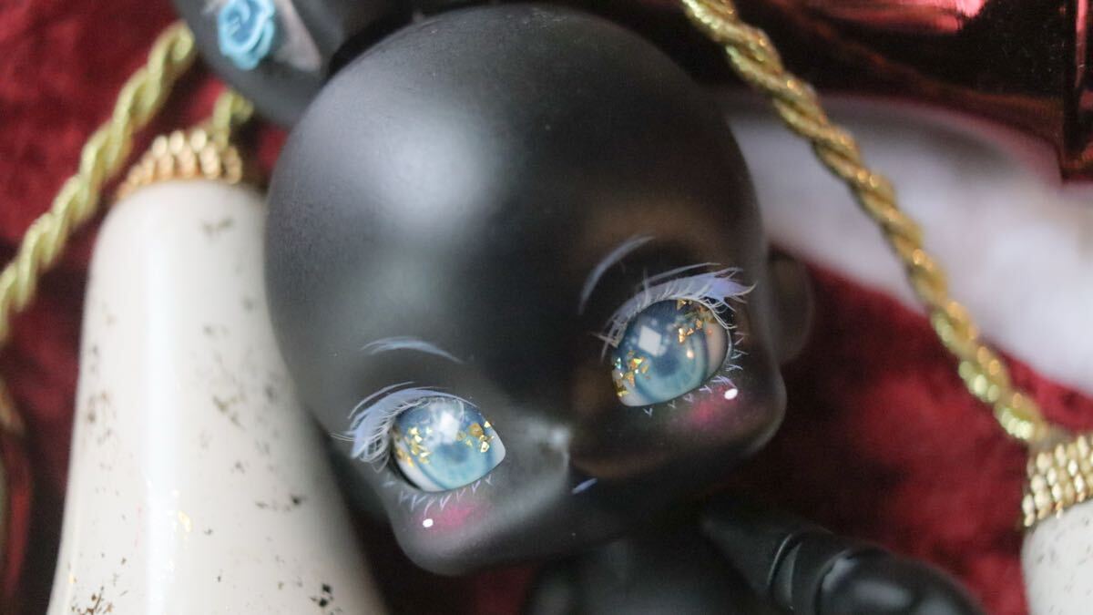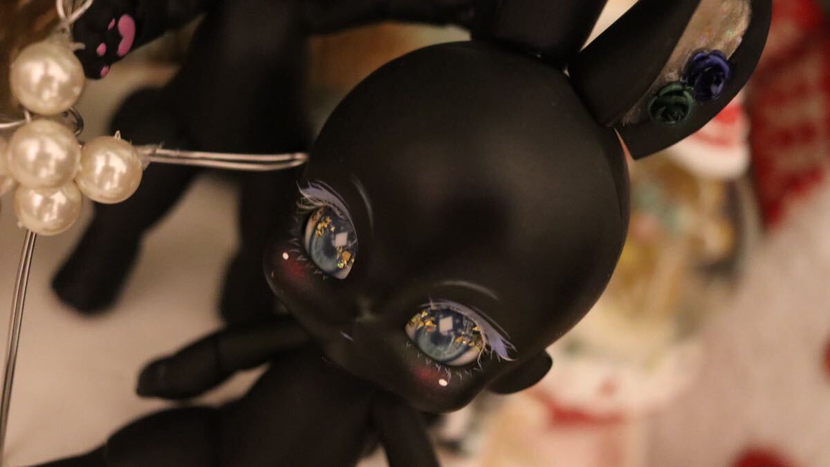 アイはKaroKaron様。白いまつ毛がついているのでグラスアイやリアルなレジンアイも似合うかと思います(うちに丁度いいのがなかったので見本がなくすいません)血色は黒には入らないのでリキテックスでぽんぽんと入れています。真っ黒な子は大変研磨が難しいので小傷があるところもあります。ご了承くださいませ。