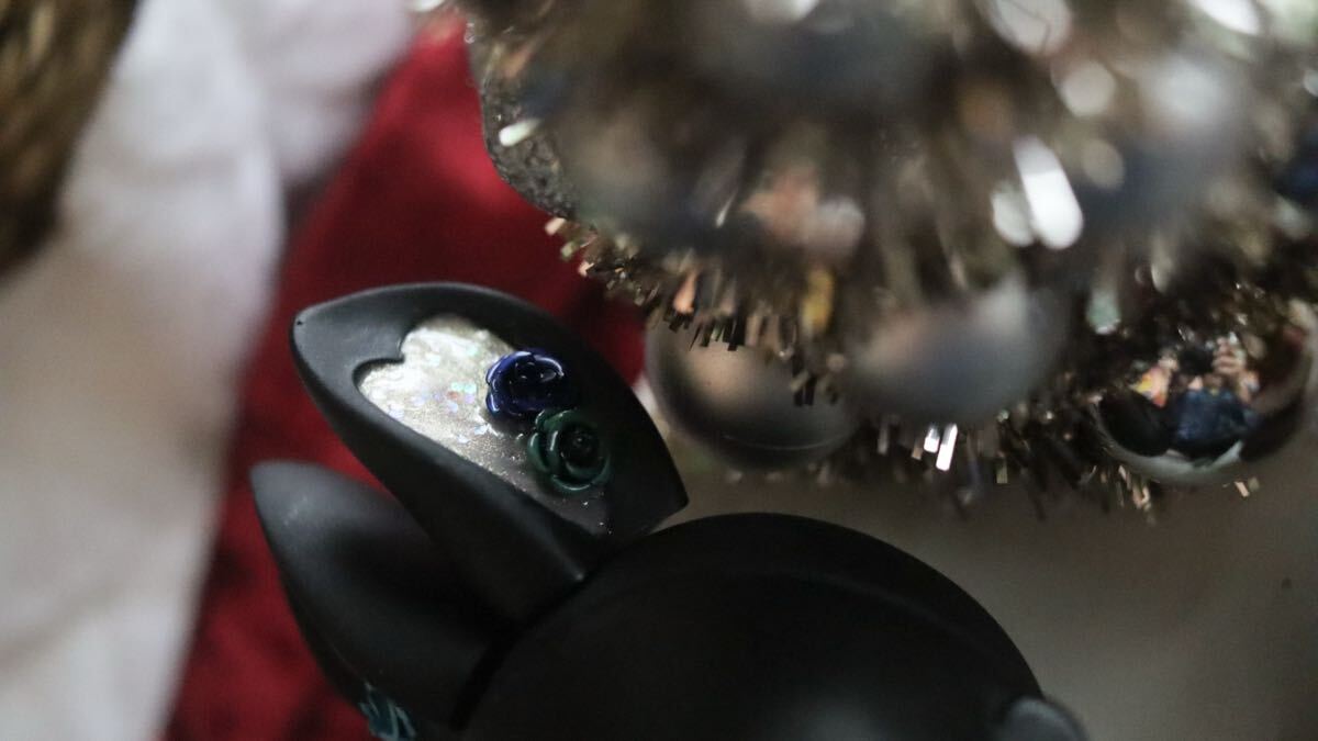 耳はジェルネイルと薔薇パーツが3つ付いております。ジェルはマグネットジェルなので角度によって偏光的な光り方をします。その上にキラキラのラメを乗せています。真っ黒な夜空にキラキラ輝く薔薇が美しいベスティです。