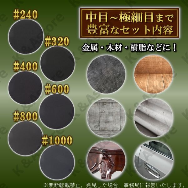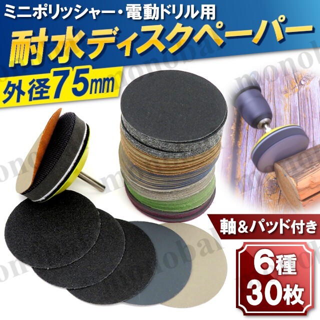 耐水ペーパー ディスクペーパー サンドペーパー サンダー ドリル ハンドグラインダー マジック式 中目~細目 75㎜ 6種 30枚 パッド&軸付属