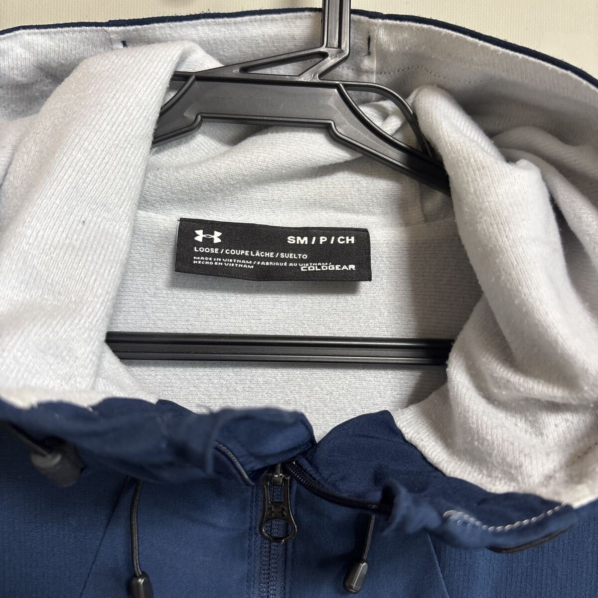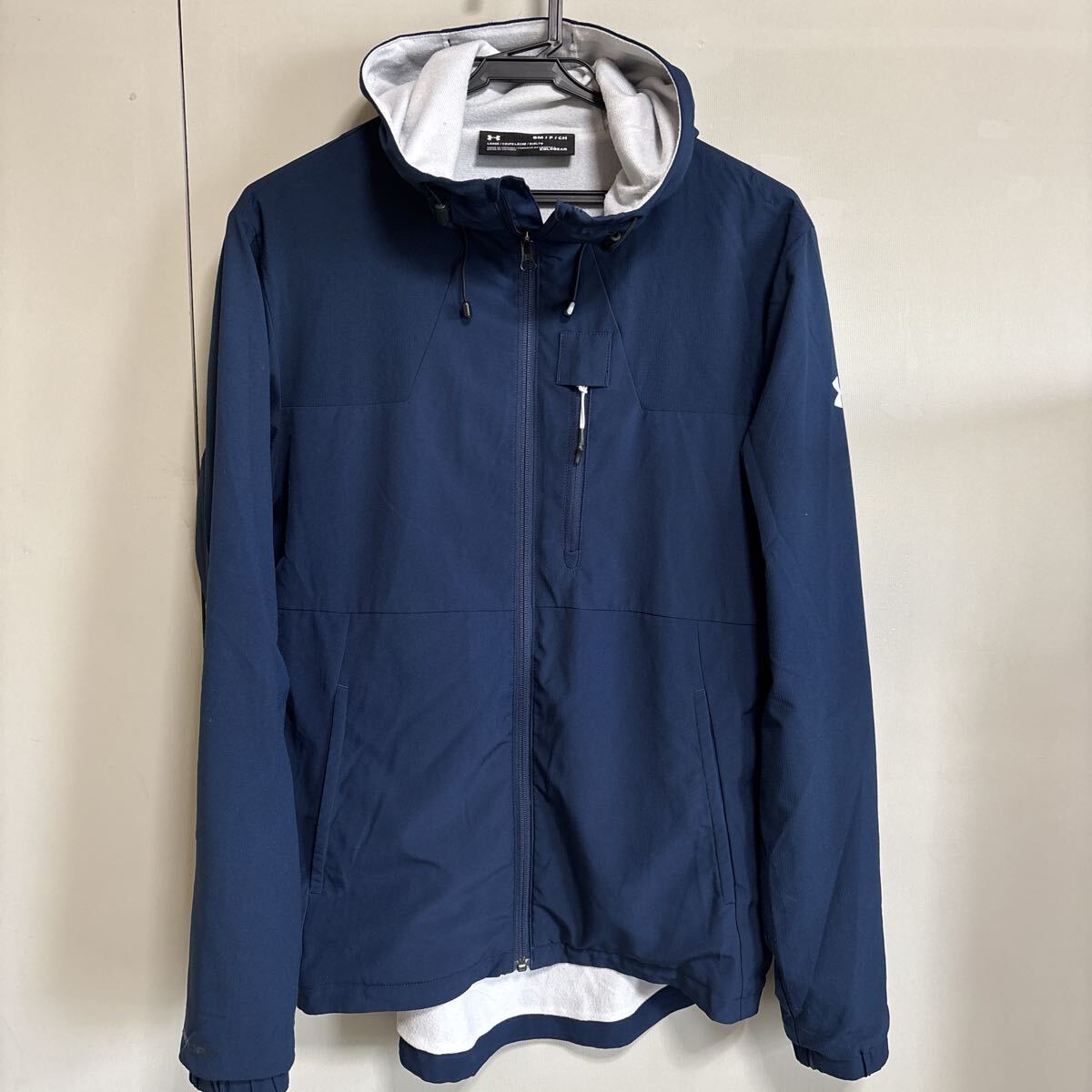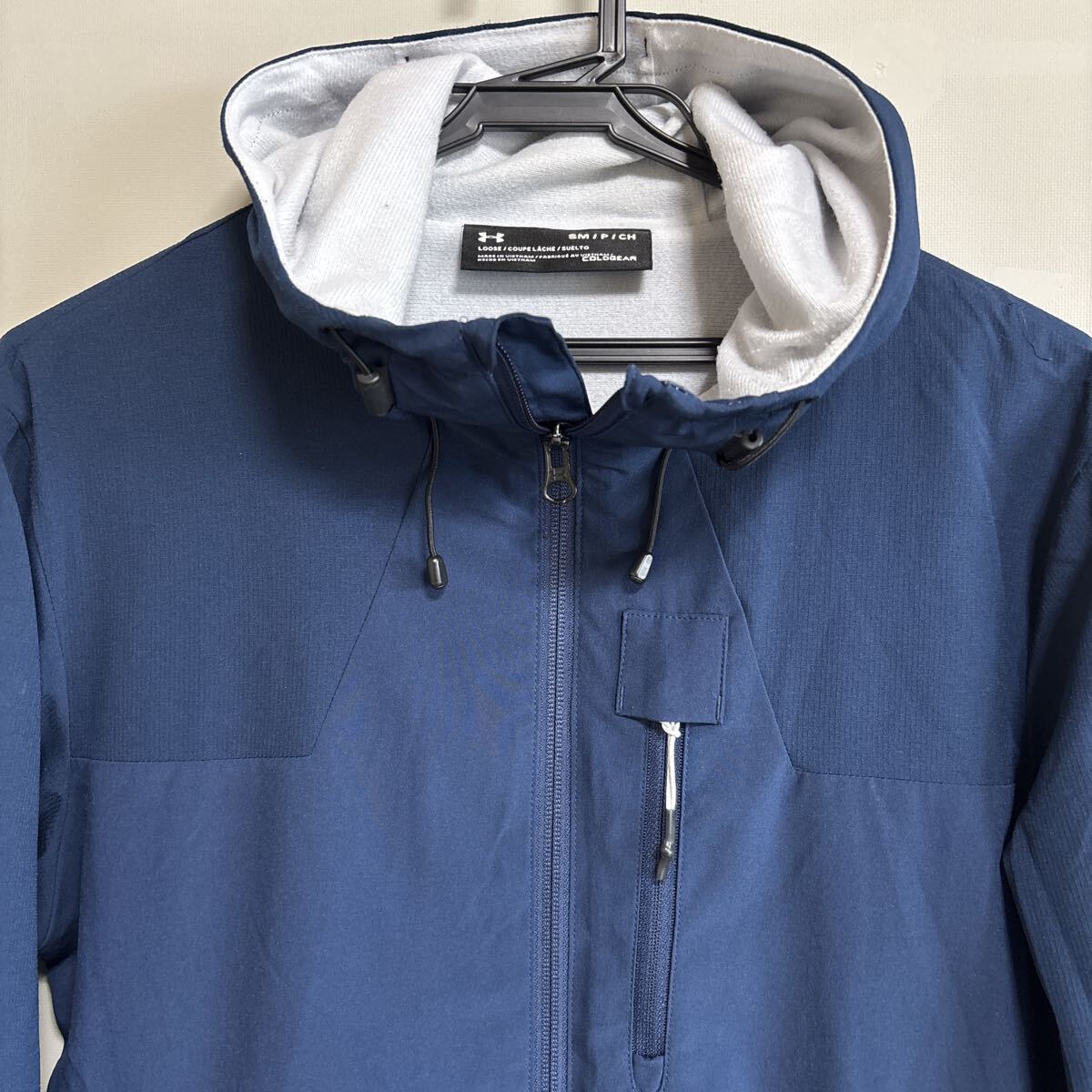 これは、アンダーアーマーのコールドギアテクノロジーを採用したフード付きジャケットです。コールドギアは、0〜10℃の気温に適しており、生地の内側の起毛が暖気の層を作り出し、暖かさを保ちます。また、吸汗速乾性にも優れており、汗冷えを防ぎます
