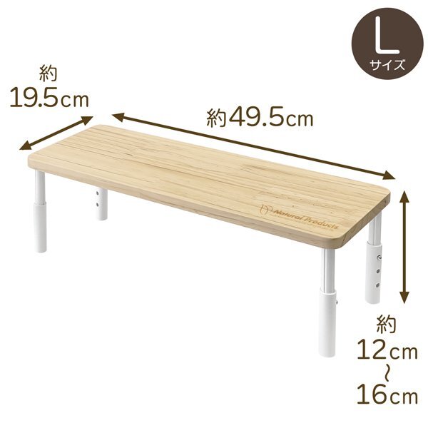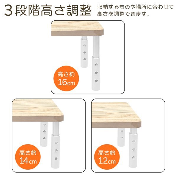 空間を有効活用できる収納ラックです。 丈夫で使いやすく、インテリアに馴染みやすいデザインです。 ■ 組み立てカンタン 天板に4本の脚を取り付けるだけ! ■ 高さ3段階調節 収納するものや場所に合わせて高さを調整できます。 12cm/14cm/16cmが選べます。 ■ 耐荷重 約5kg ■ 脚に滑り止めつき ■ 本や文房具、コスメ、調味料の収納などに |