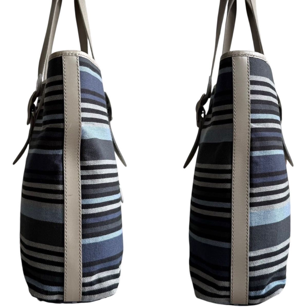 ポールスミスらしさを象徴するマルチストライプを、ブルートーンを中心にシックにまとめた洗練された表情。カジュアルすぎず、ビジネスシーンにもスッと馴染む上品な色使いです。ボディには丈夫で軽量なキャンバスを、アクセントには上質な本革を使用。素材のコントラストにより立体感と高級感を引き立てています。