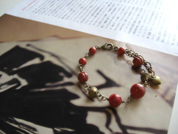 やさしいシルエット・・シリーズです♪豹柄・マニア・・シックな赤のスポンジ珊瑚のブレスレットです♪6ミリから10ミリ位までの丸玉やSラインの珊瑚にデザインメタルを合わせました♪長さは全長23センチ位で調節自由です♪お揃いのブレスレットやネックレスも出品しています♪シンプルで飽きの こないいつまでも着けられるデザインを考えて作り ました♪ハンドメイドをご理解頂いてノークレーム、ノーリターンでお願いします