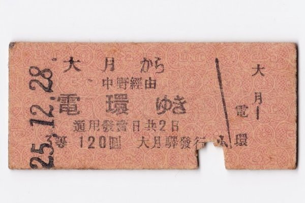 ●国鉄● 昭和25年 大月から中野經由 電環ゆき 【 通用發賣日共2日3等 120圓 】 B型券 大月驛發行【9335】