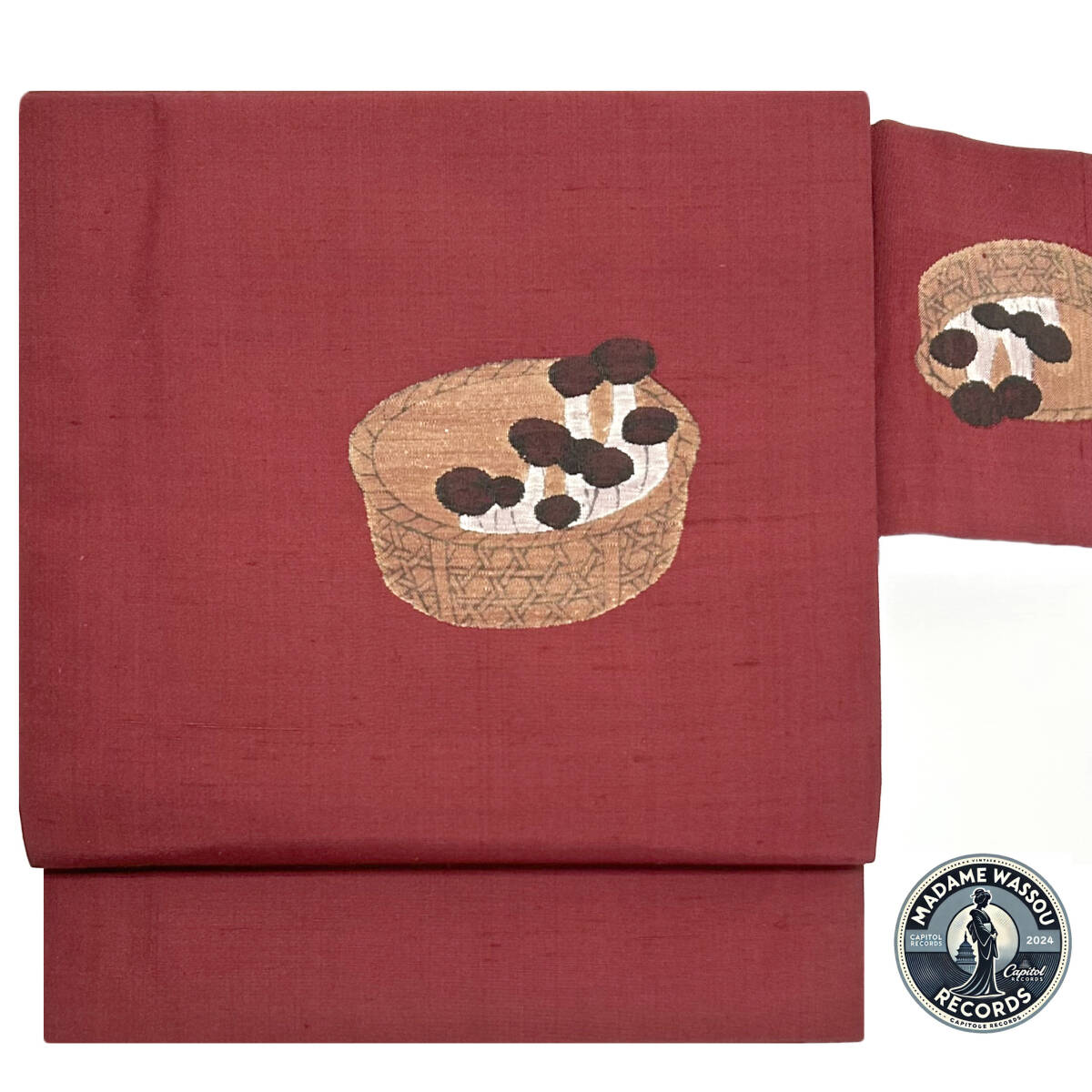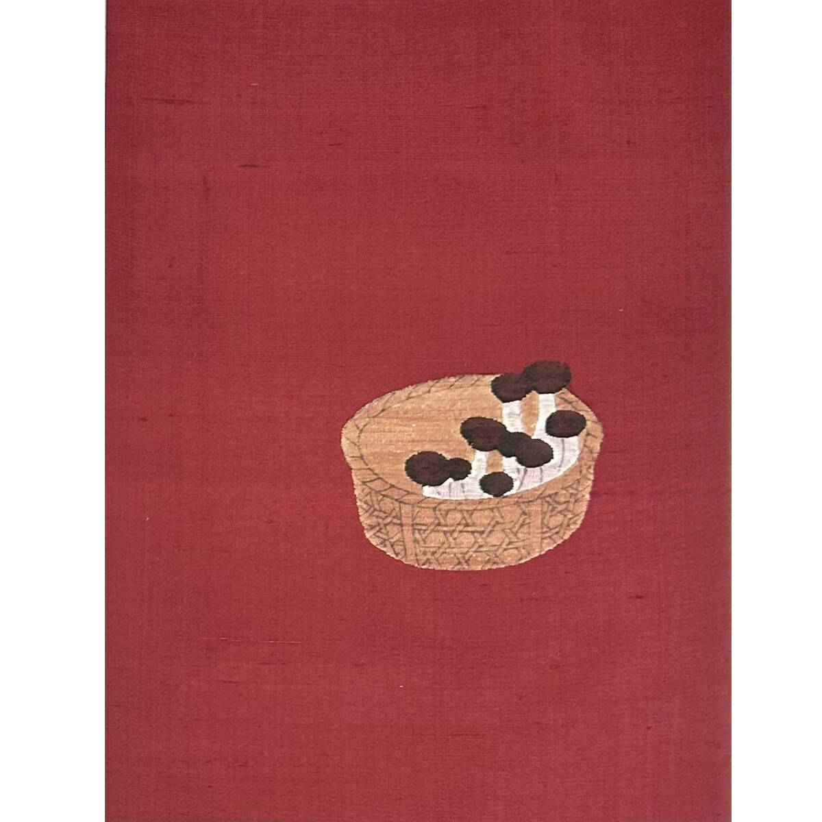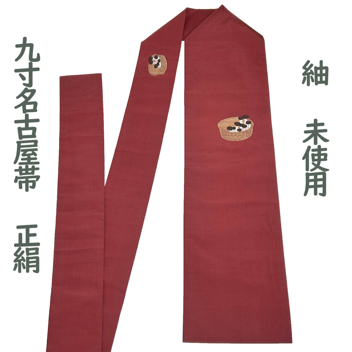 ふんわりと柔らかいレッドブラウンの紬地に、そこにワンポイントの可愛らしい籠に入ったしめじ柄が織り出された九寸名古屋帯です。どうぞこの機会に是非ともご検討下さい!
