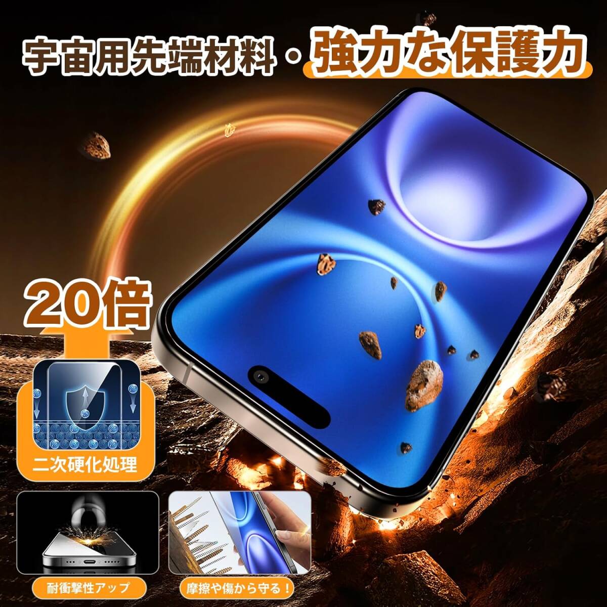 • 【強力な保護力】iPhone 16用ガラスフィルムには、日本製の高強度材料ガラスを採用し、表面硬度9Hに達します。一般的な熱強化処理を行った後に、6500°の二次硬化処理を行って、落下に対する耐性が非常に高いです。日本国内で累計10万枚以上販売されており、画面の破損記録はゼロです。