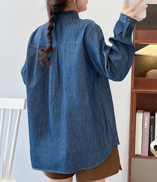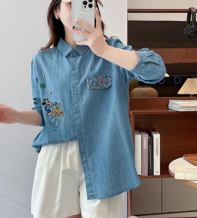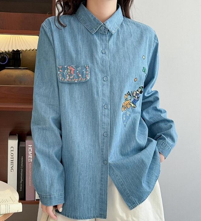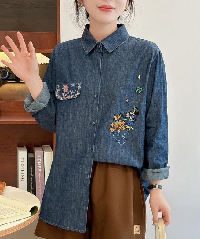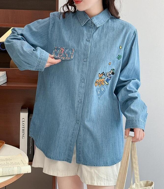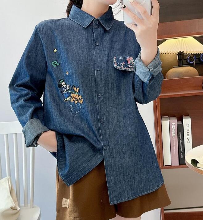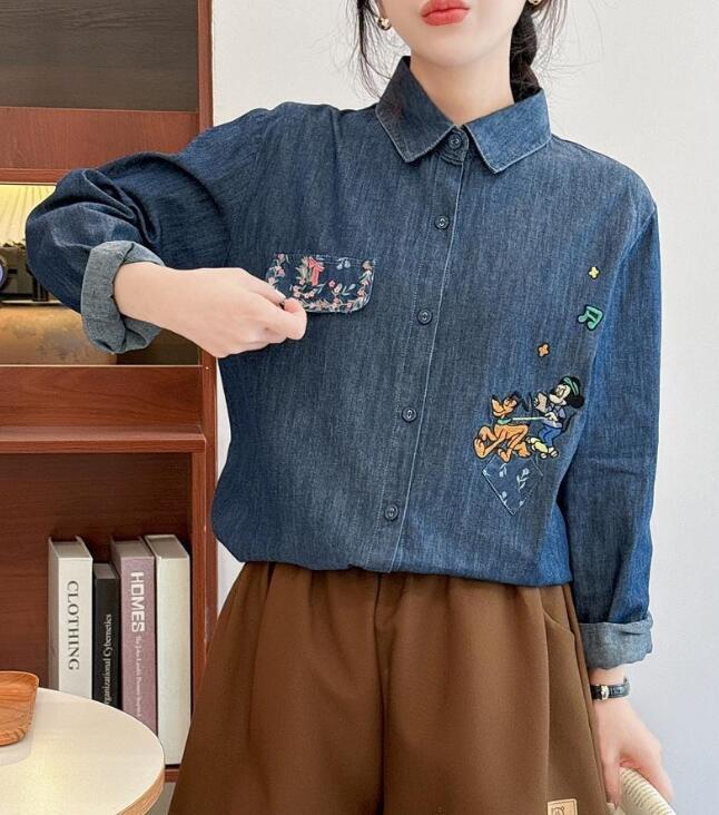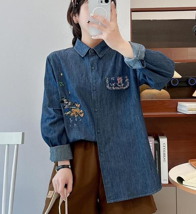 新作ブラウス フリーサイズ ワイシャツ チュニック トップス 綿100% 大人可愛 ナチュラル サラサラ 通気性肌触り抜群 刺花柄 デニム