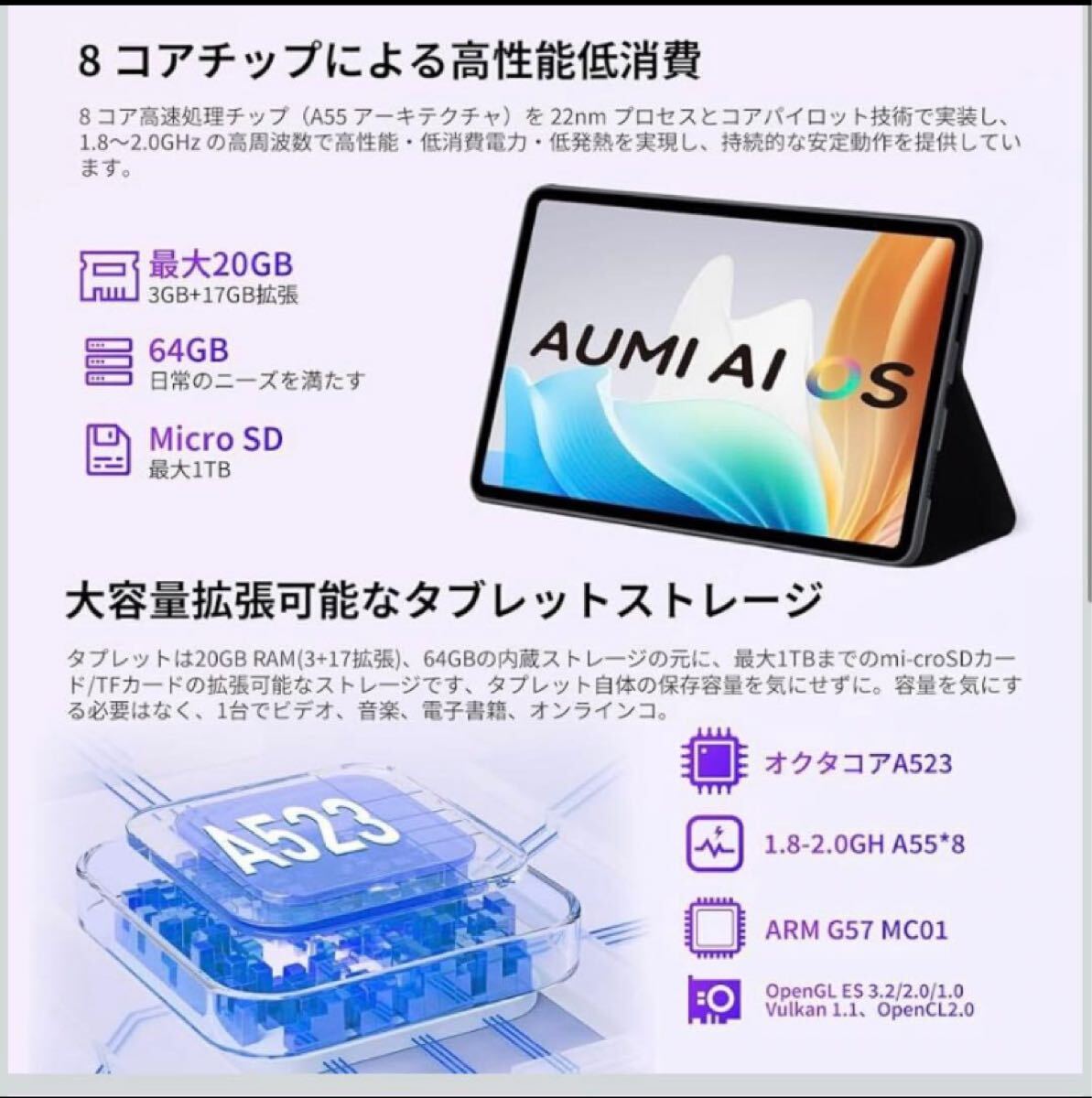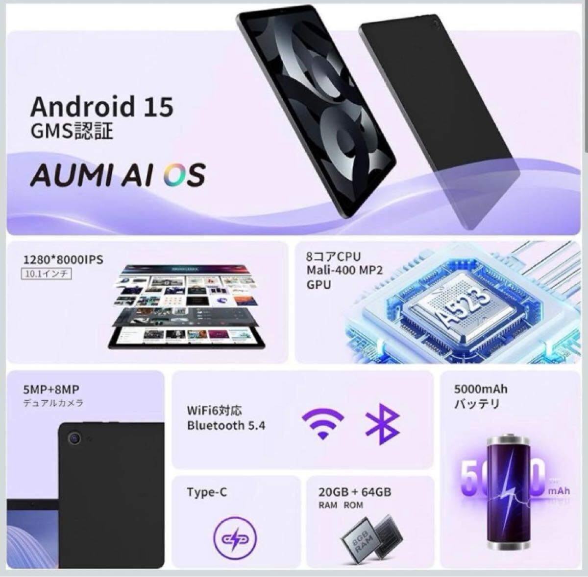 メモリは、仮想RAMを含む20GBで、マルチタスク処理が快適です。ストレージは64GB内蔵し、最大1TBまで拡張可能なmicroSDカードスロットを備えています。ディスプレイは10.1インチIncell-IPSで、1280×800の高解像度と鮮やかな色彩で、高画質な動画視聴に適しています。カメラは800万画素のリアと500万画素のフロントを搭載し、日常の撮影やビデオ通話に対応します。