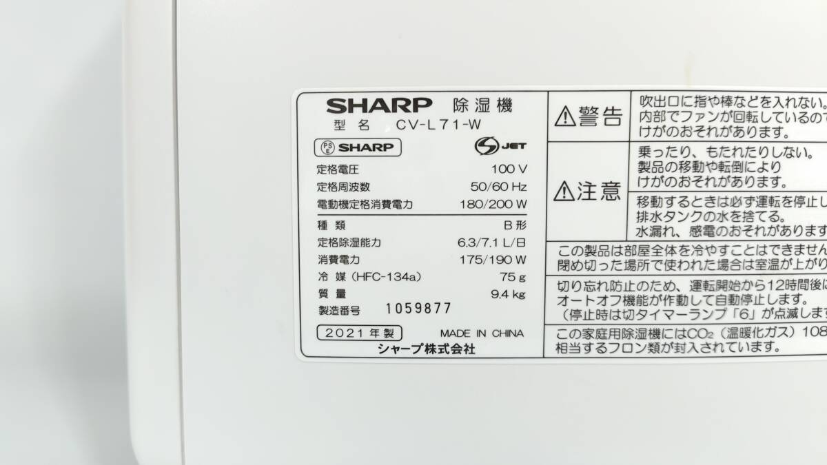 シャープ 衣類乾燥機 除湿機 7.1L / プラズマクラスター 7000 スタンダード 8畳 / ホワイト CV-L71-W