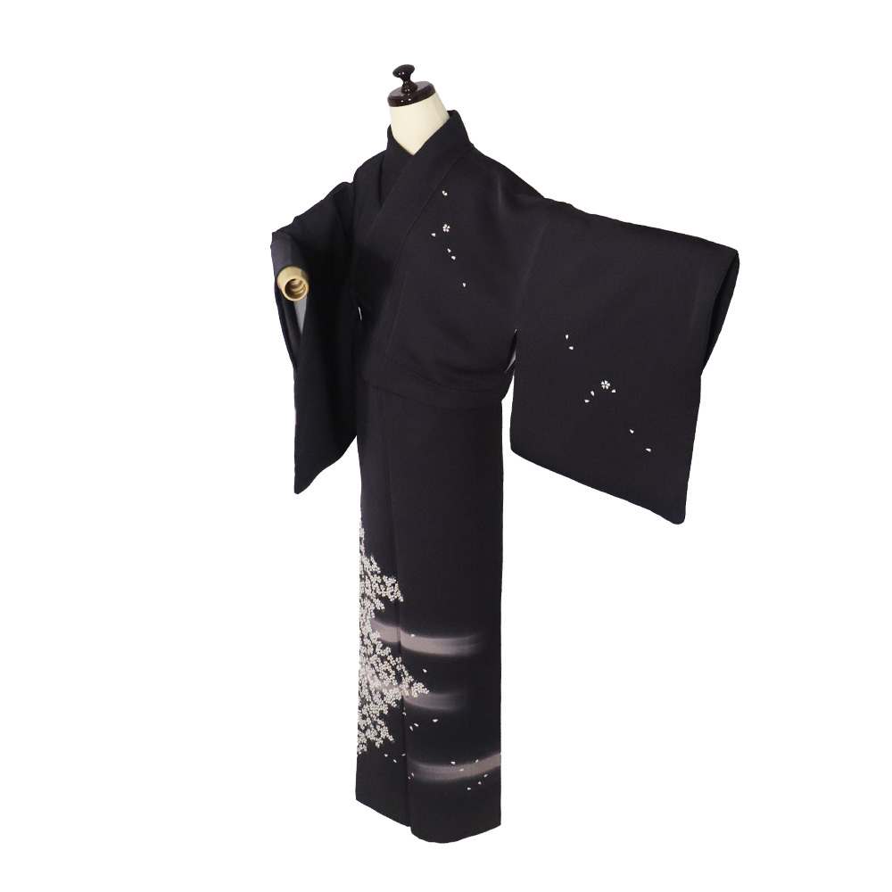 | 商品 | 友禅訪問着 袷 濱縮緬地 墨黒(黒色)・薄グレー(潤色)・暈し地 桜 158 広襟 |
