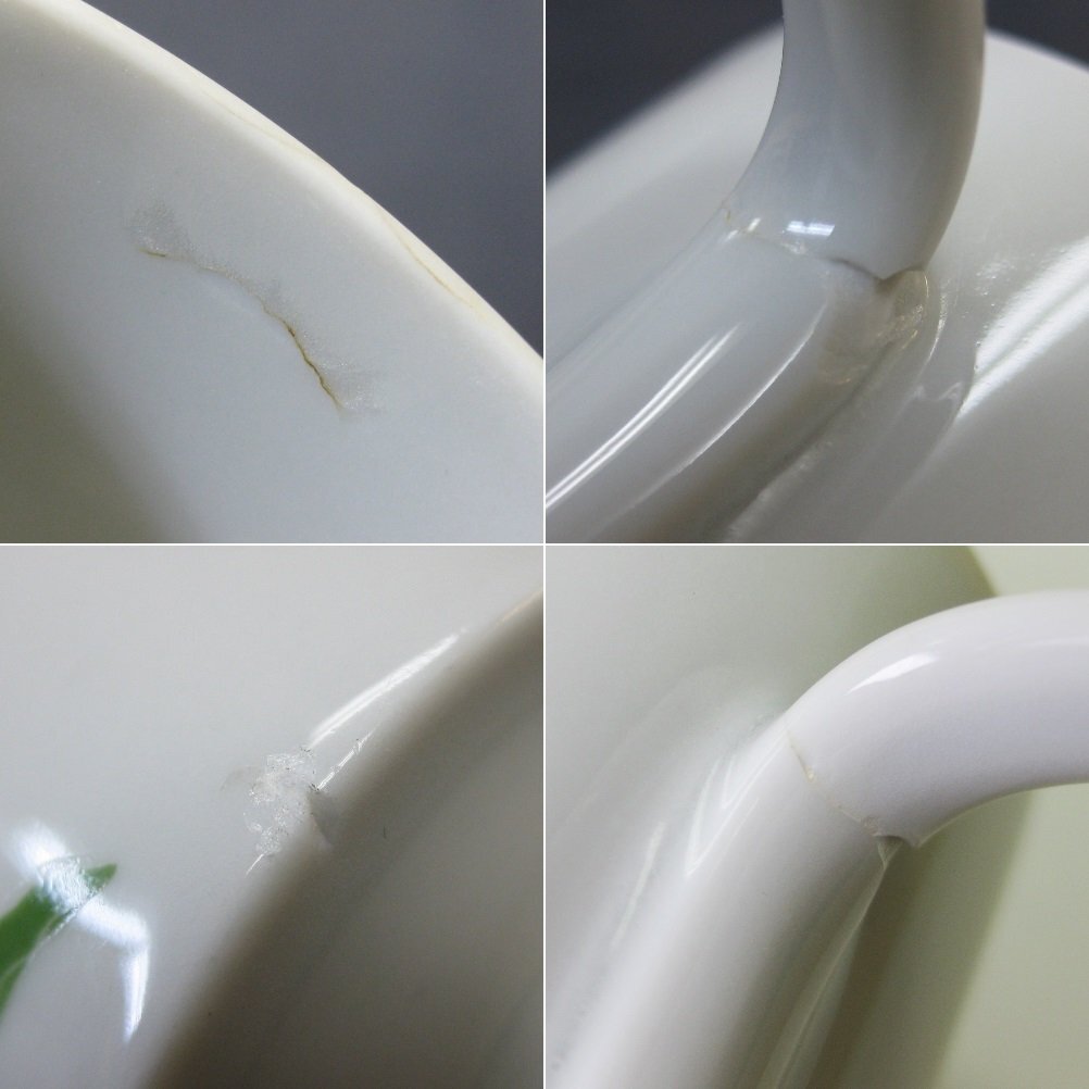 | 状態 | 使用によるキズがあります。ピンク花のカップはB級品(スクラッチ有)です。上部に貫入り、底角にカケ、ハンドルにヒビ・カケがあります。一部商品のマークに経年のヒビ割れがあり、ハゲがあります。 |