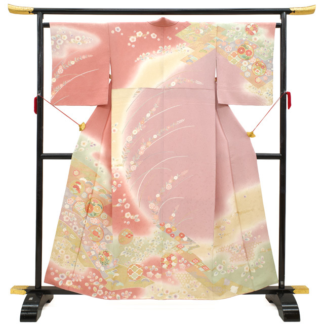 訪問着 袷 着物 正絹 金駒刺繍 金彩加工 ピンク系 四季の花 フォーマル 中古 仕立て上がり 身丈159 裄丈64.5 Mサイズ みやがわ sb16605