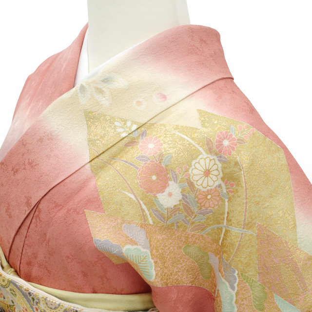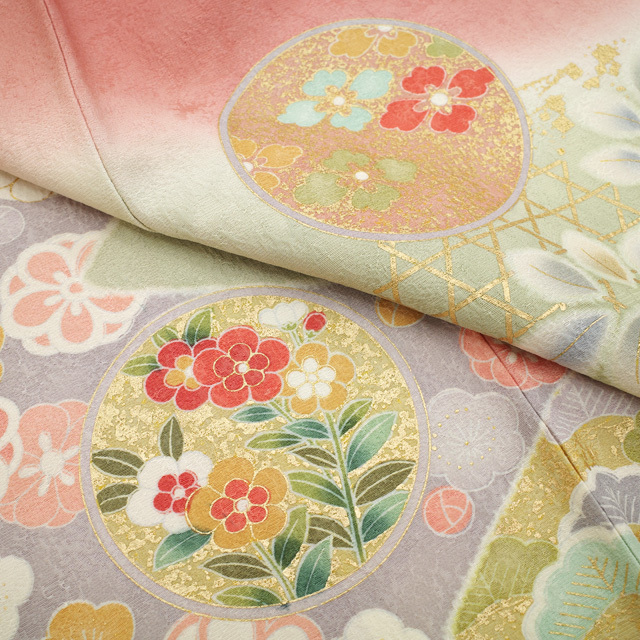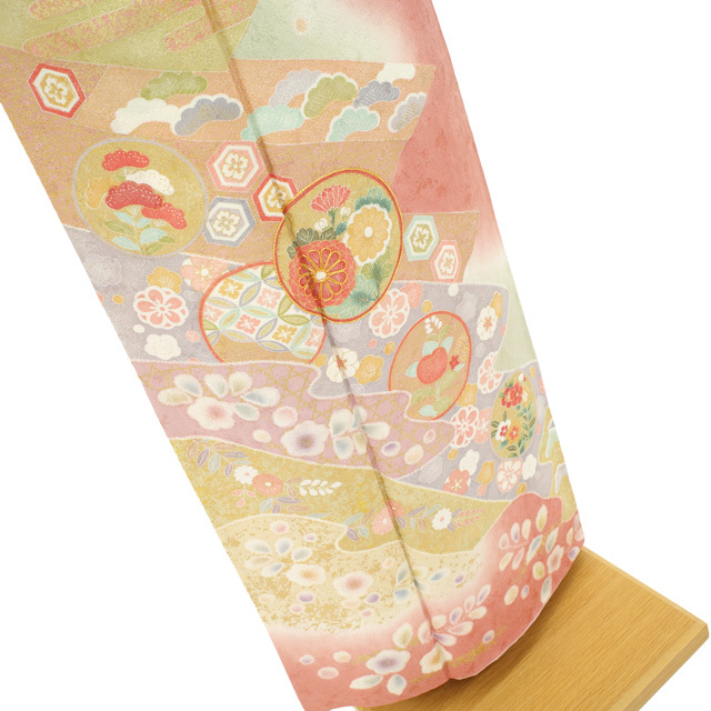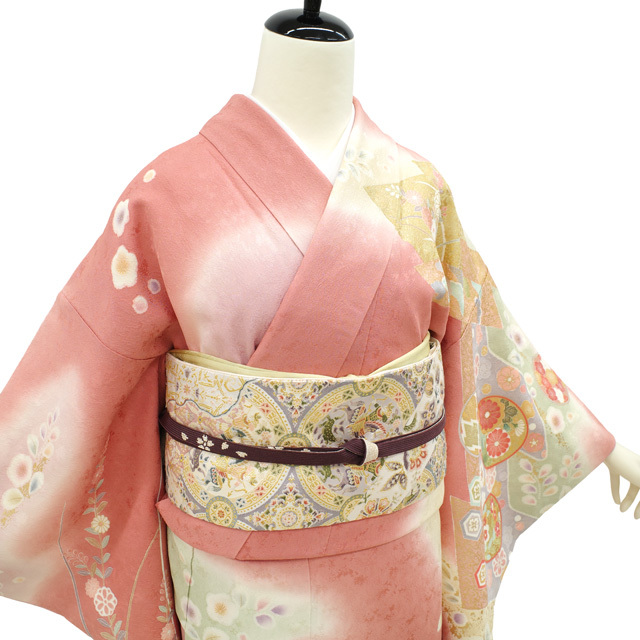 地紋が浮かぶ上質な生地を使用し、真赭色・ピンクベージュ・蒸栗色・薄山葵色など、やわらかく上品なお色味でおしゃれに染め分けられています。