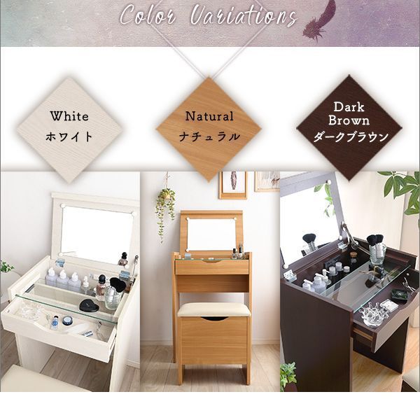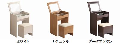 【ポイント】 ドレッサーが欲しいけどスペースに困る…という方にオススメです。 リビングにも置けるコンパクトサイズ! その上、スツールとコンセント付きなので、その場でサッとお支度OK! ミラー付き天板を閉じればデスクとしても使えます。 美しい木目調のホワイト、ナチュラル、ダークブラウンの3色からお選びください。 |