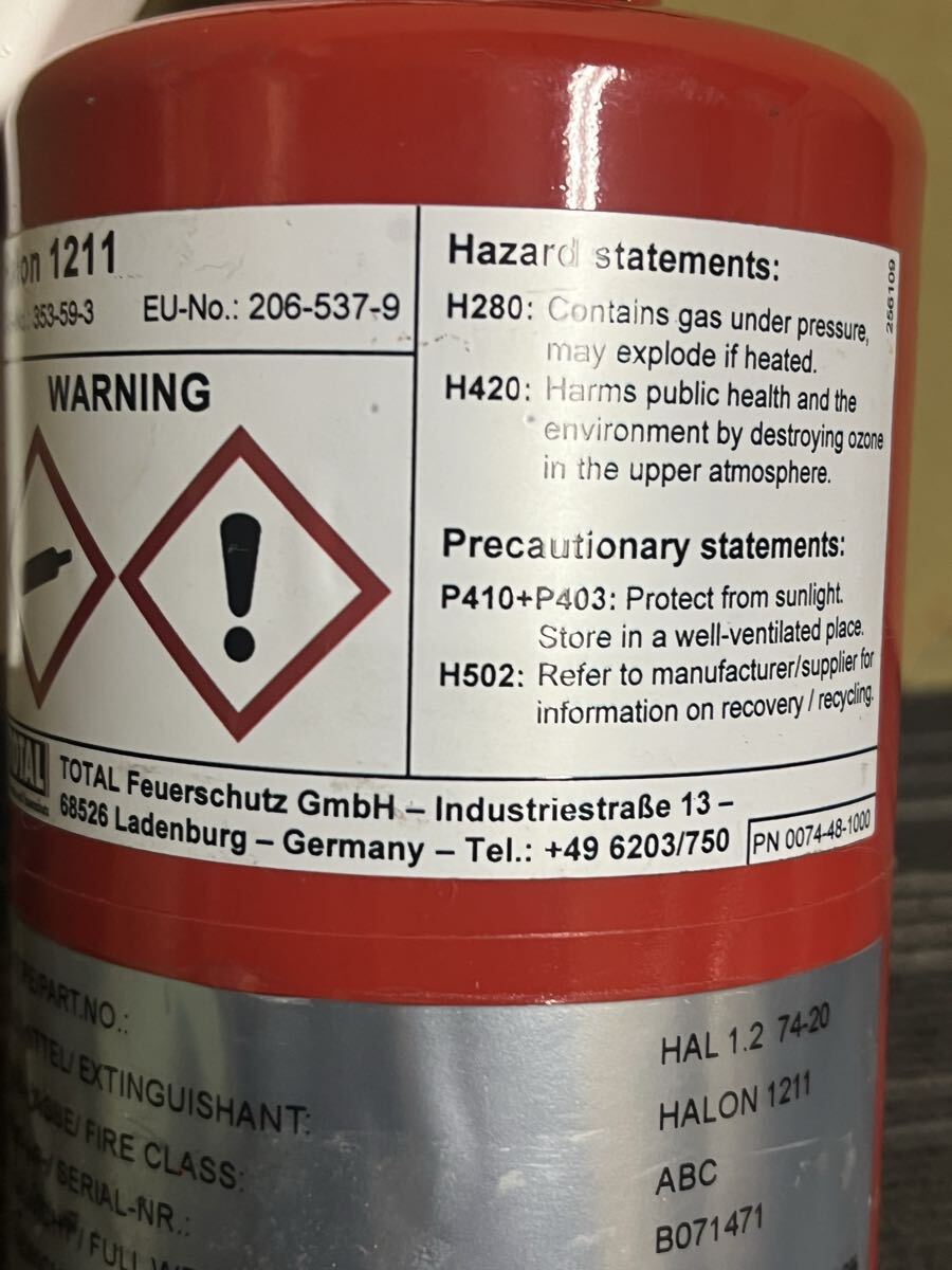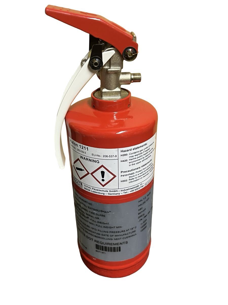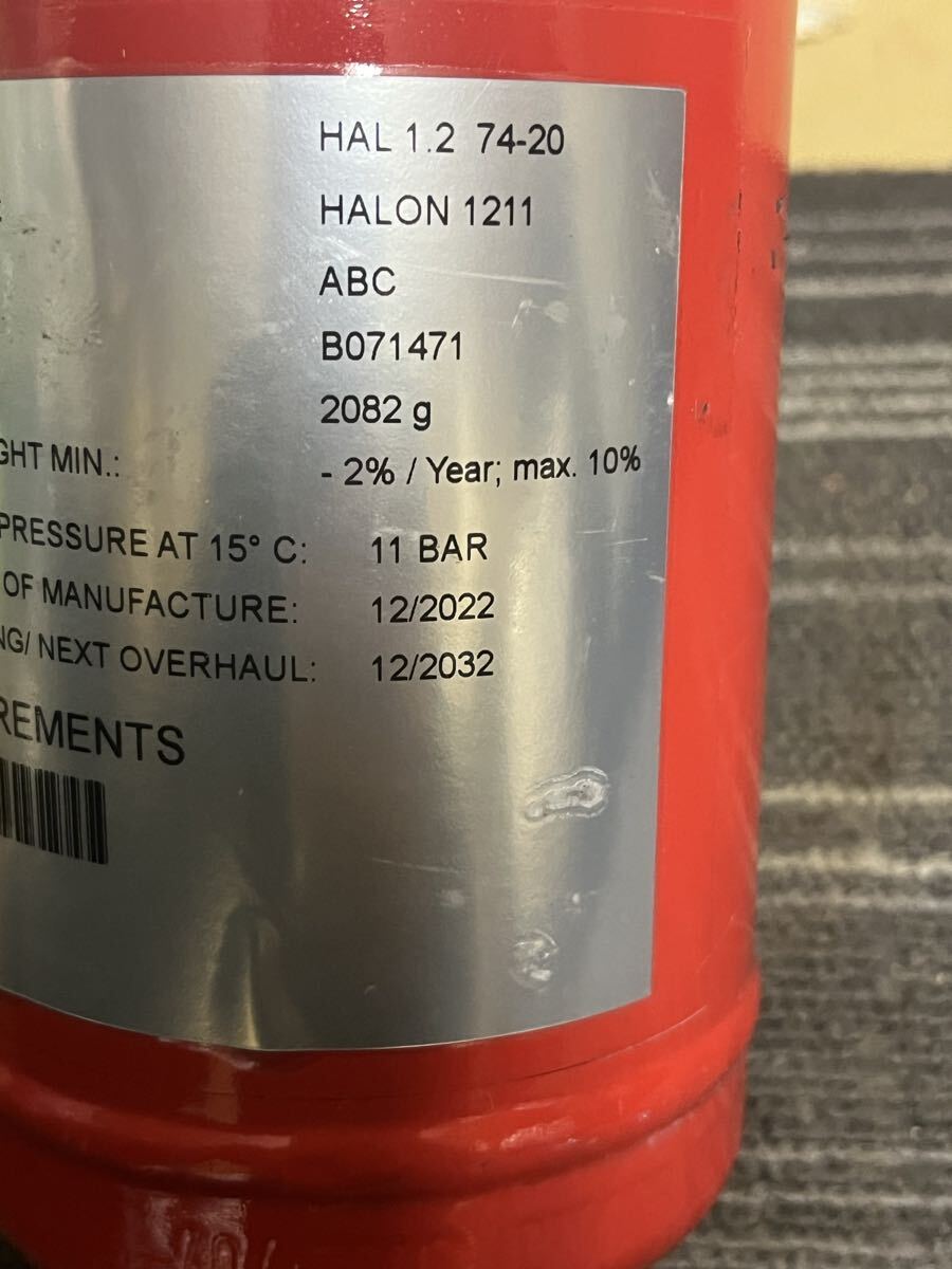 コックピット消火器は、ハロン 1211 消火剤を使用し、火災クラス A、B、C に対応し、特に液体火災や電気構造物の火災での使用に適しています。