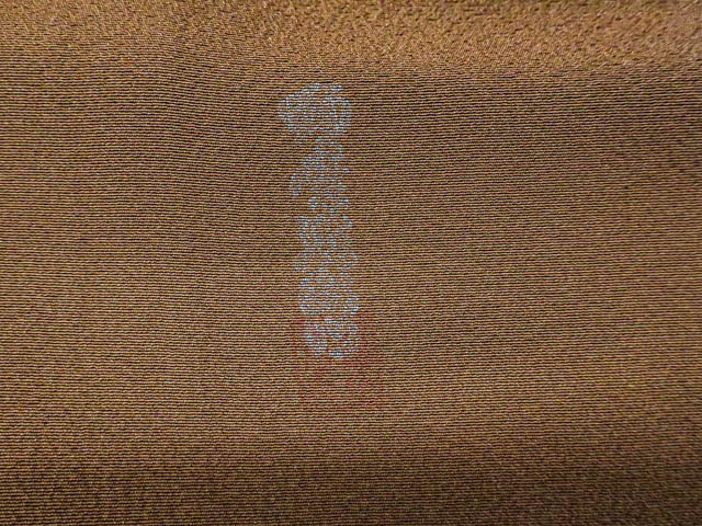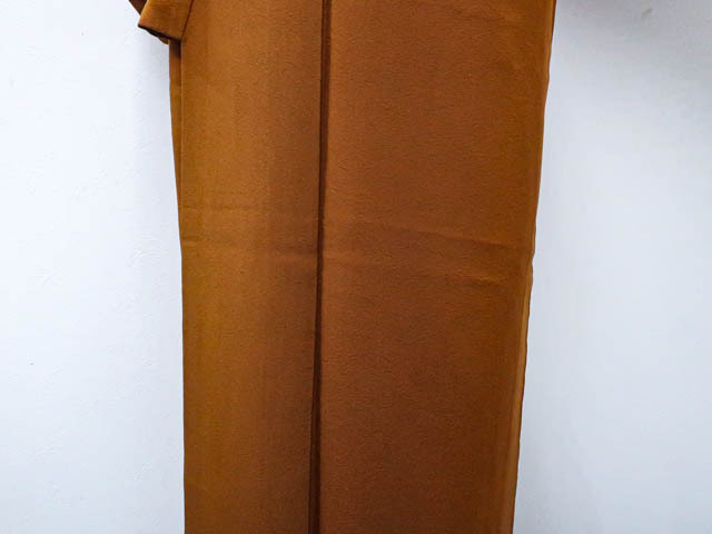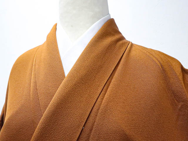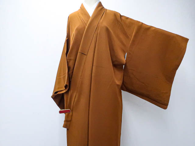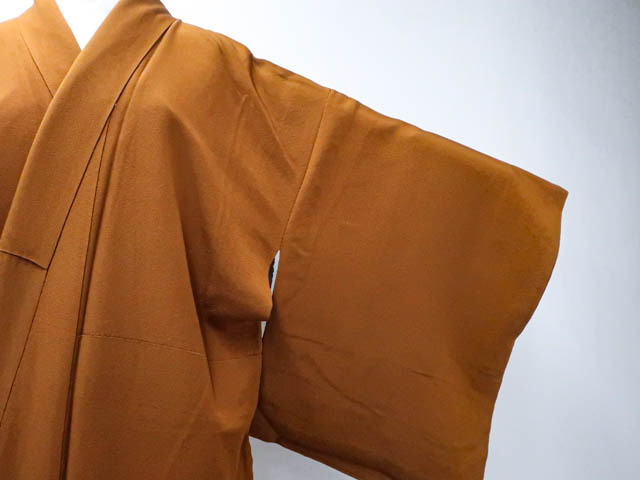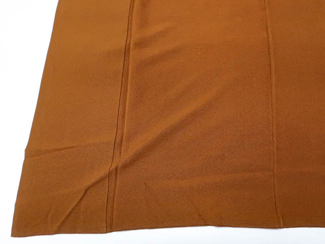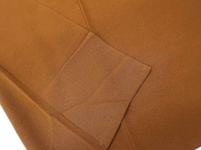 リサイクル商品のため、保管しわがございます。 衿と上前・右前袖に薄汚れがございます。 胴裏衿裏にスナップボタン汚れがございますが着用可能なお品です。 地色は茶です。 1枚目の画像が近いお色かと思われます。 素材は正絹です。 |