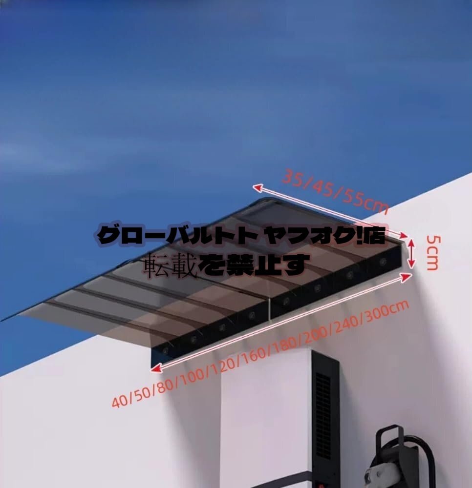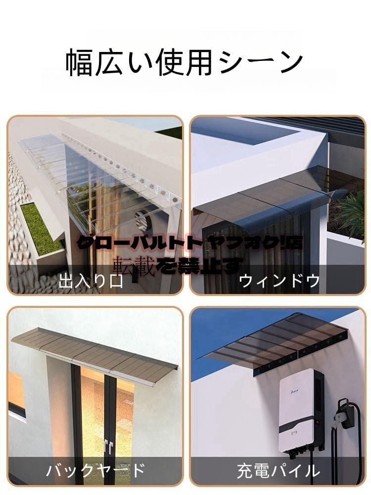 パティオの日よけは PC シートでできています、安全で安定しており、強い耐衝撃性、抗酸化性、高温耐性、低温耐性があります。ボードの表面は特殊加工されています。 UV の 80% をフィルター処理し、家具を保護します。 過酷な環境下(-40℃~120℃)でも通常使用可能。正面玄関の雨よけの湾曲したデザインは、目に見えない屋根パネルの張力支持を自然に形成し、雨水はアーチ状の表面に沿って自然に排出されます。 エンデュランスボードは雨水で洗った後、単独で洗浄できます。サイズ:40~200cm , 50~200cm , 60~300cmパネル材質:PCシートアフターサービスカスタマーエクスペリエンスを重視しています。ご不明な点がございましたら、時間内にお問い合わせください。喜んでサービスを提供いたします。