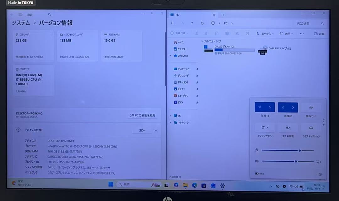 スペック:i7-8565U/@1.99/16GB/SSD 256GB/15インチ以上