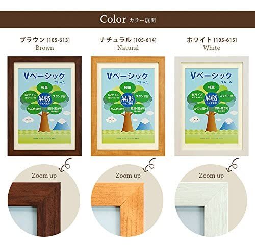 木目で落ち着きのあるフレームです。 壁掛用吊金具・吊りひも付 縦横兼用スタンド付 パッケージ:かぶせ箱(白箱) マット1枚付(白) 窓寸: B5判 W172×H242mm