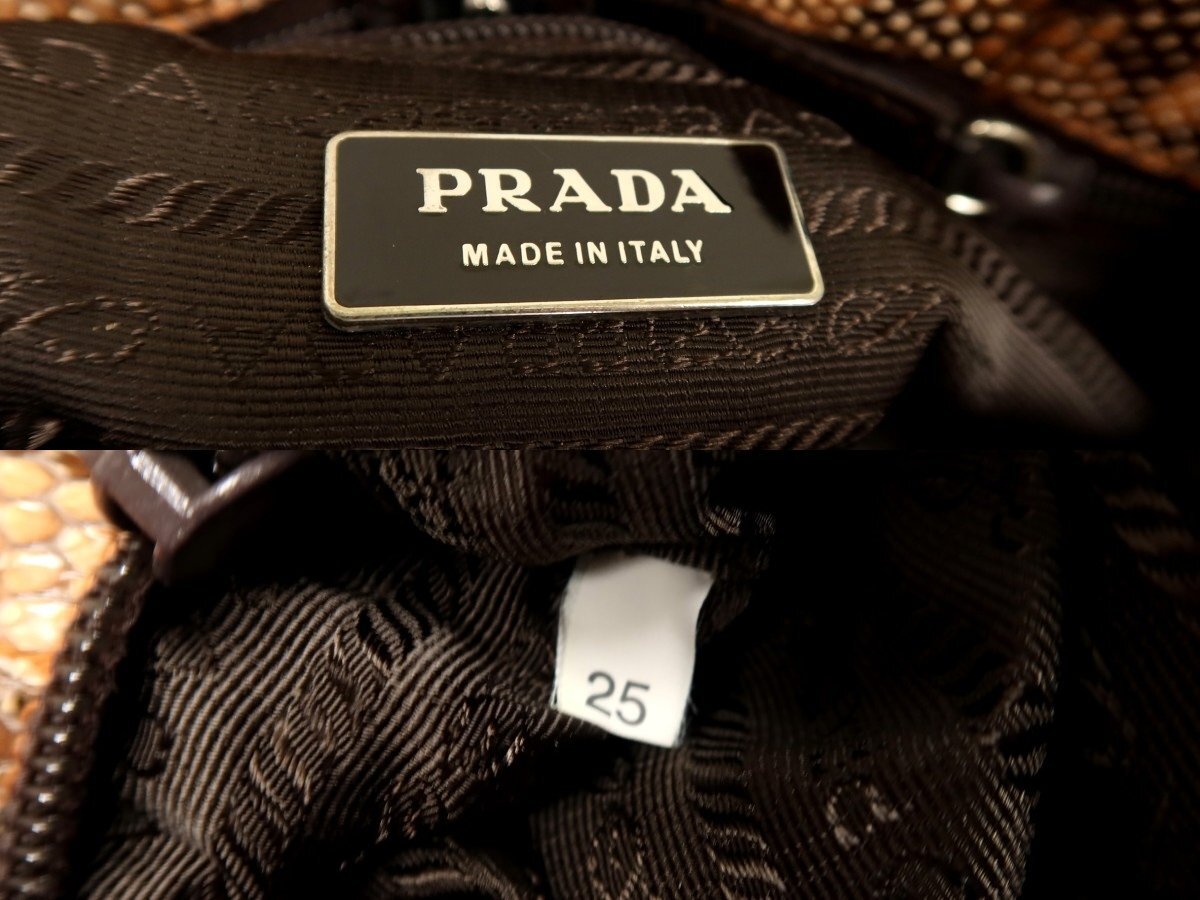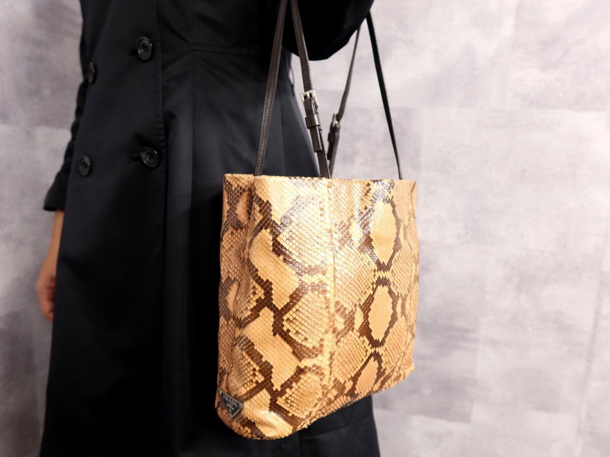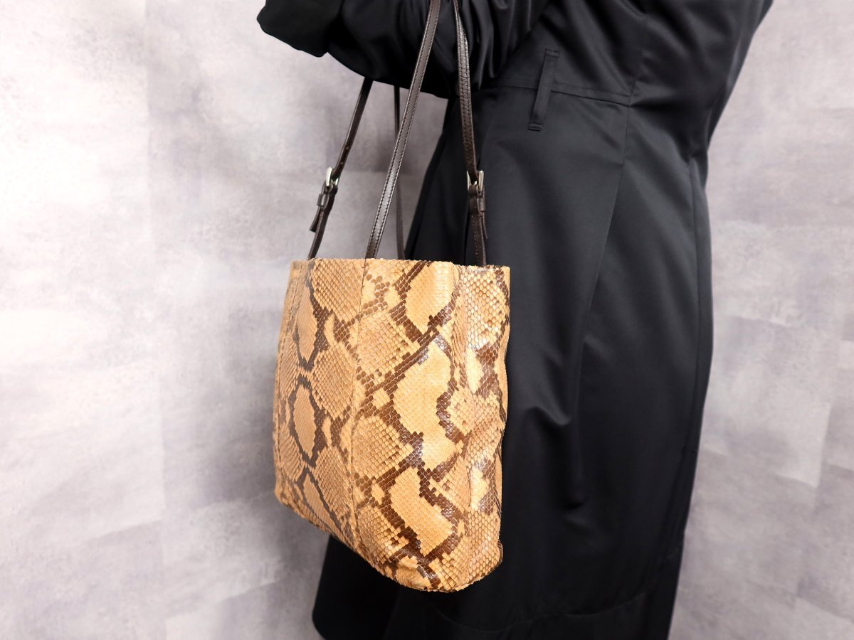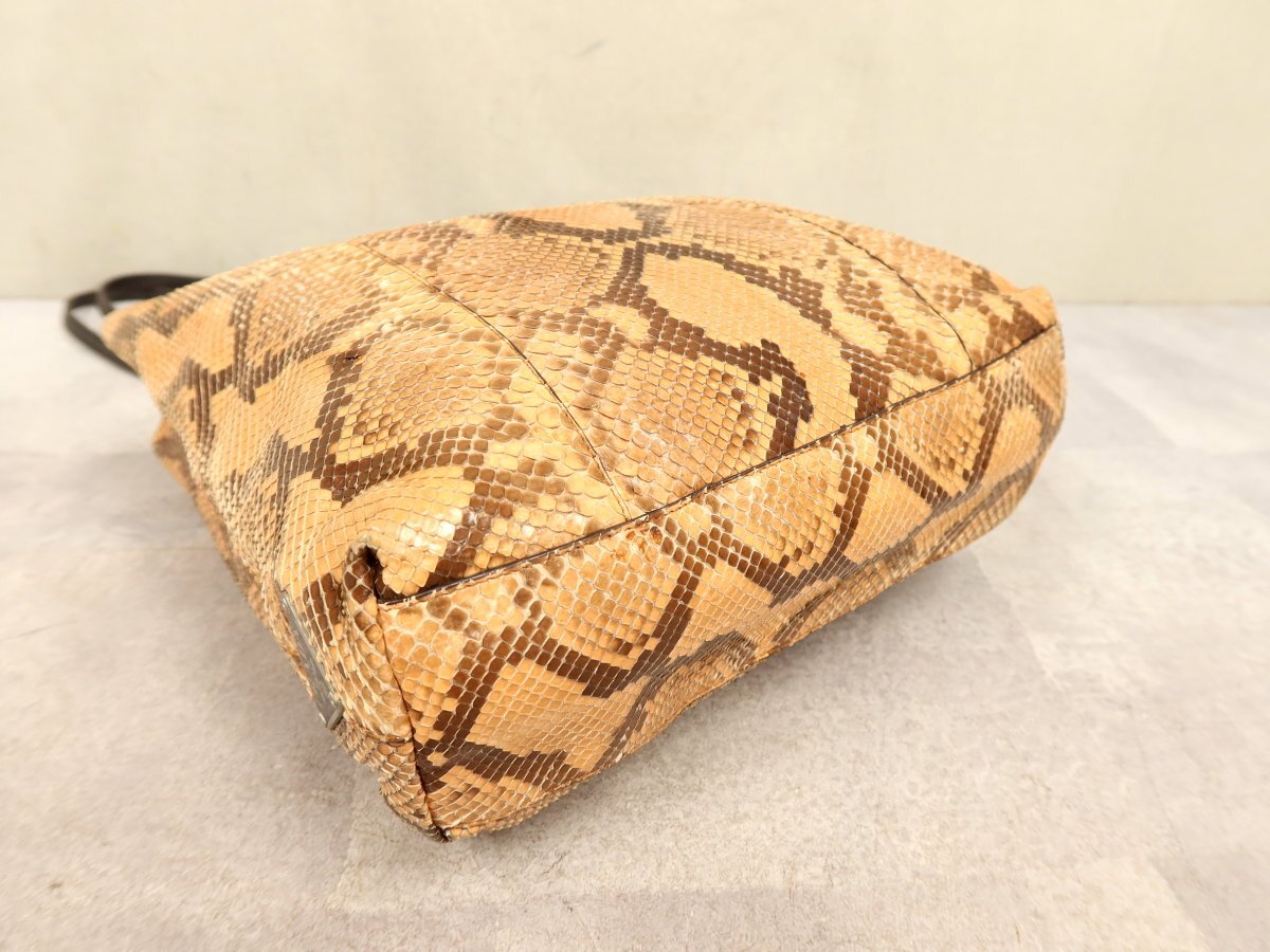 ●超美品●PRADA プラダ●三角ロゴプレート●パイソン 本 ヘビ 革●トート バッグ●ブラウン系●シルバー金具●イタリア製●収納●Js62303