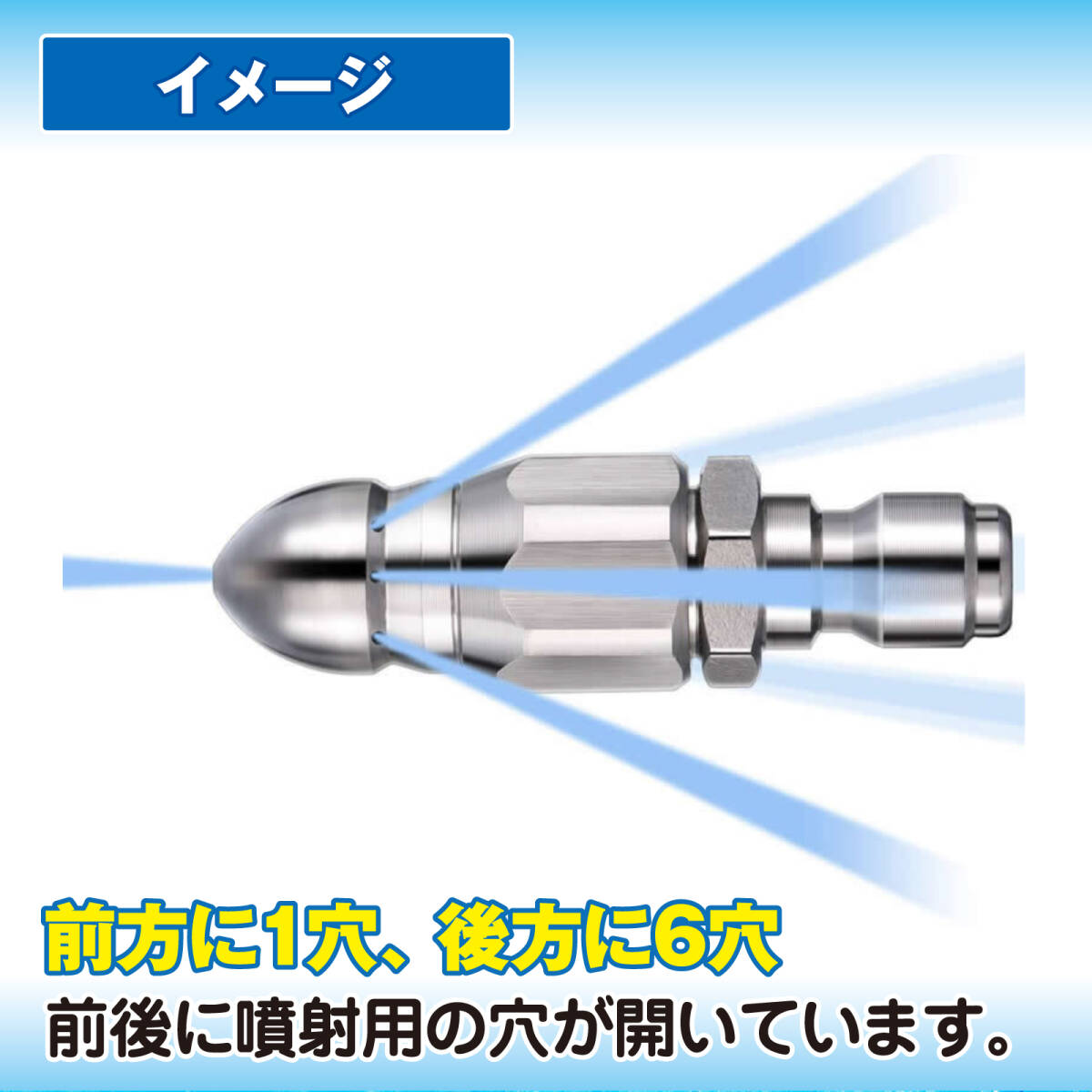 【逆噴射ノズル】先端に一つ、後方に六つの噴射用の穴が開いております。排水管の詰まりのトラブル解決や、洗浄等にご利用頂けます。