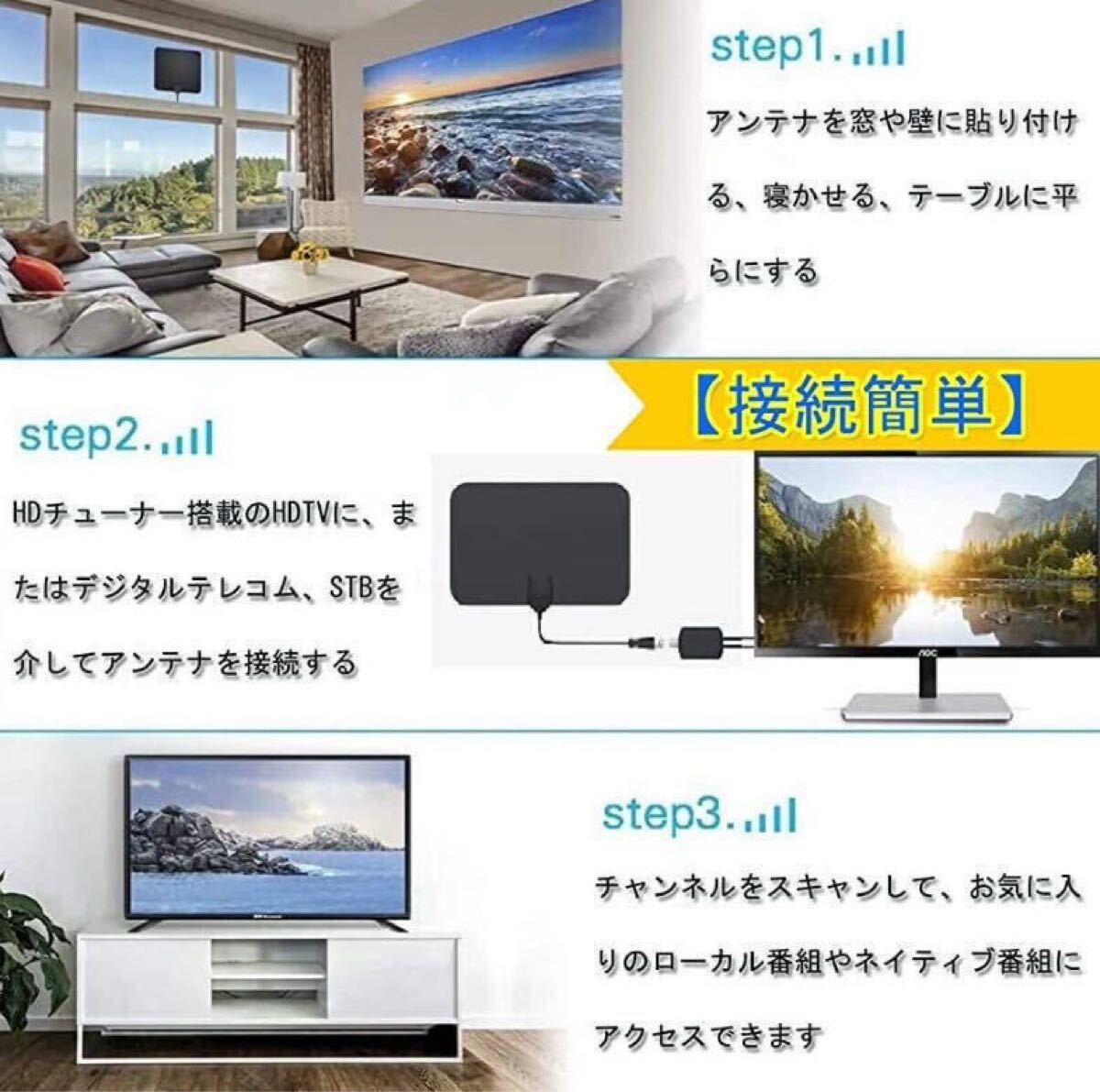高感度受信アンテナ、ブースターアンテナ、TVブースター、4.4M同軸ケーブルを使用しているため、他社製品よりも受信強度が高く、そのため、出力画像がより鮮明になります。
