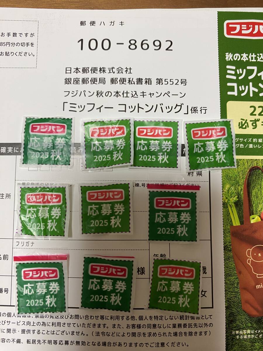 フジパン 応募券 秋の本仕込みキャンペーン 2025秋 10枚 ミッフィー バッグ