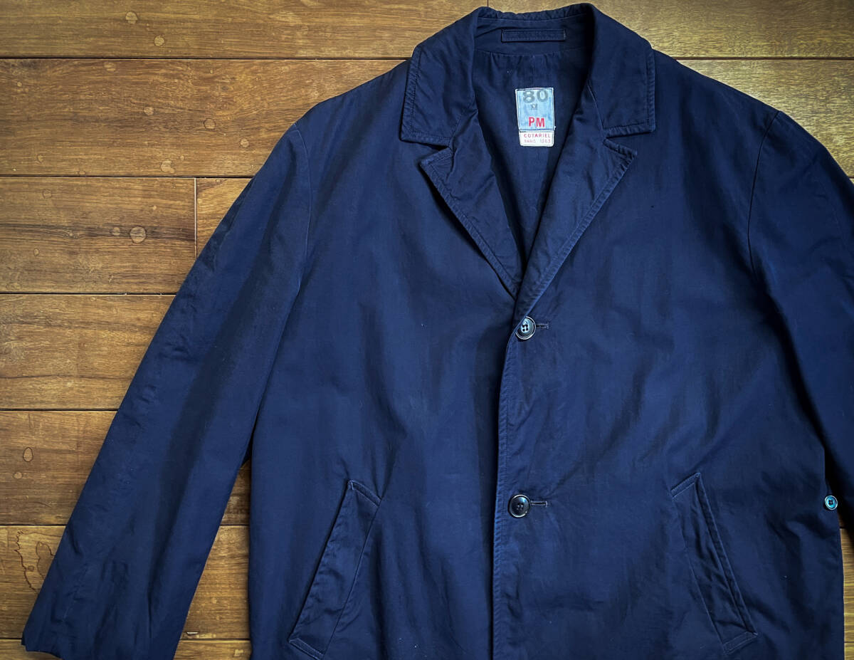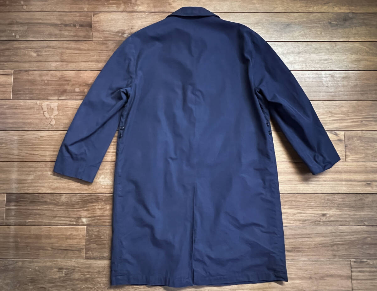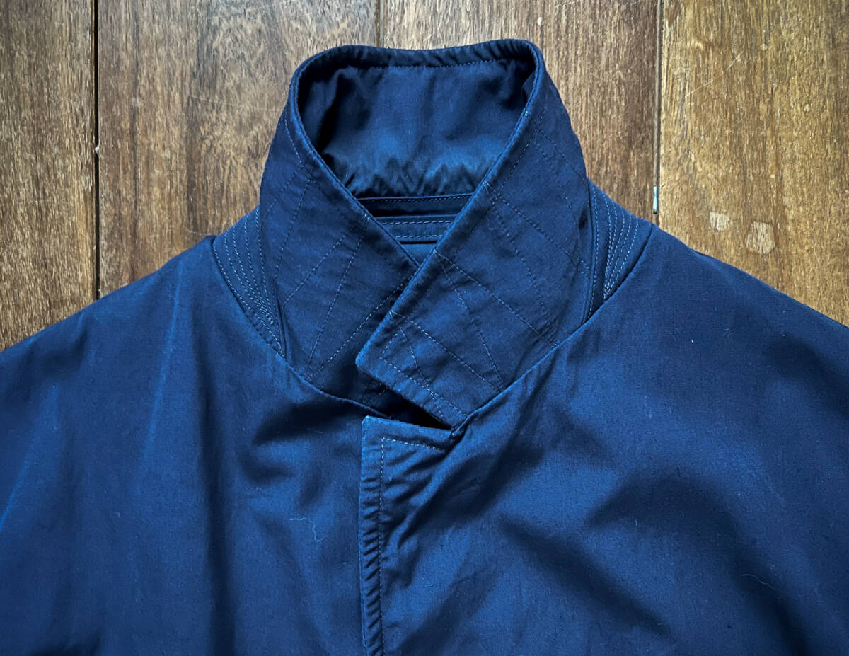 シンプルなシングルタイプのコート。カラーはややナス紺よりのネイビー。素材はおそらくコットン100%。打ち込みの強い、張りのある生地感です。さらには、裏地も同じ生地を使用した無双仕立てになっています。生地自体はそんなに厚くありませんが、無双仕立てによりしっかりとした着心地になっています。