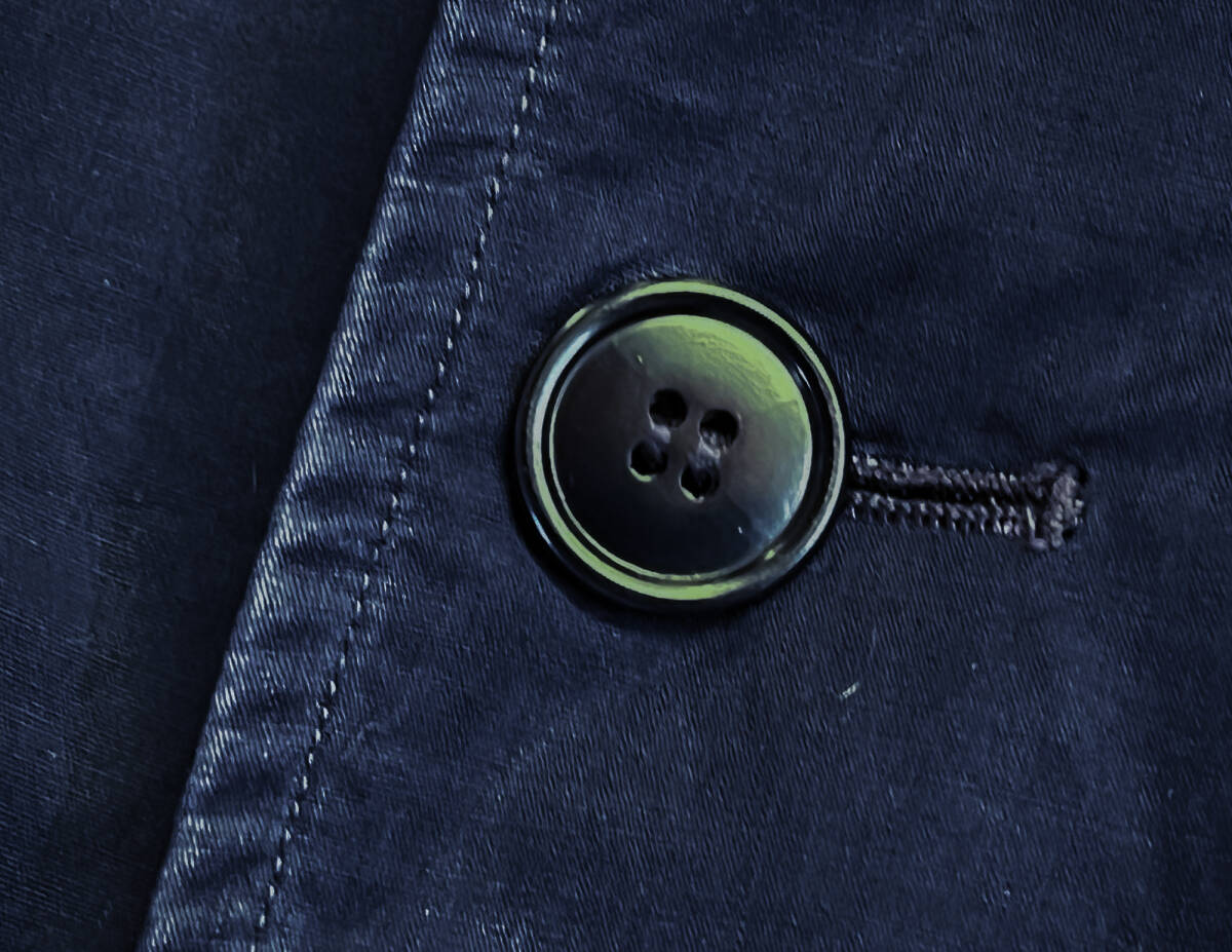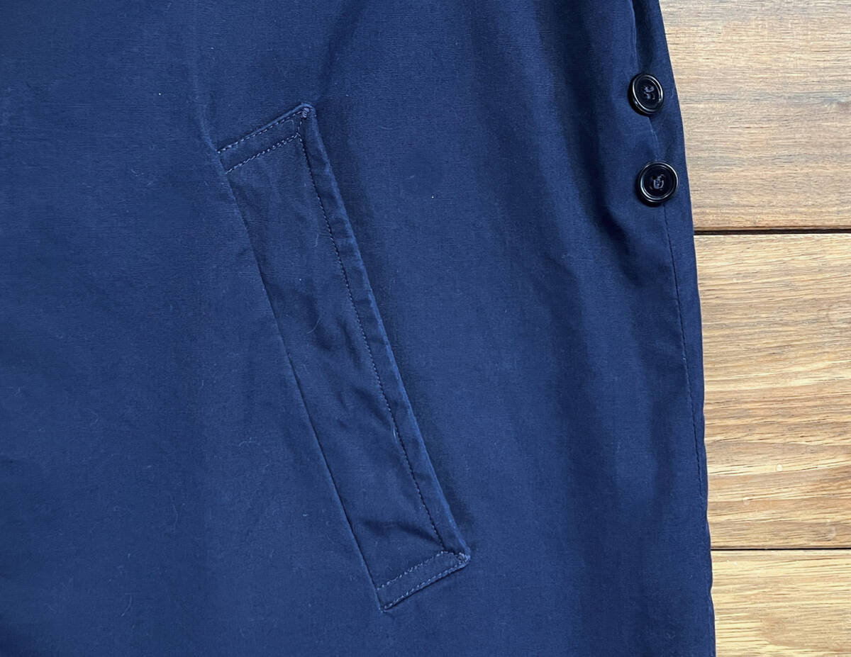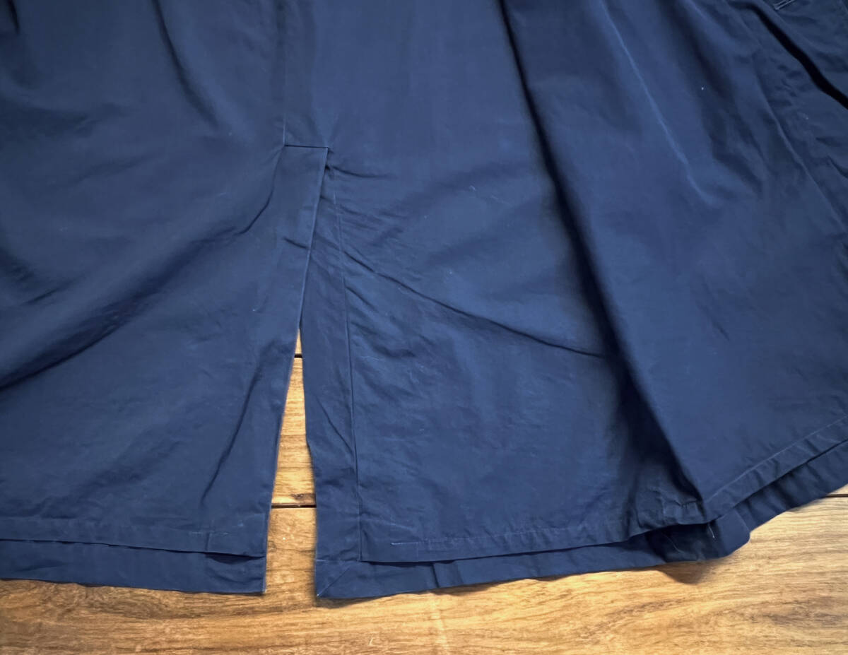 シンプルなシングルタイプのコート。カラーはややナス紺よりのネイビー。素材はおそらくコットン100%。打ち込みの強い、張りのある生地感です。さらには、裏地も同じ生地を使用した無双仕立てになっています。生地自体はそんなに厚くありませんが、無双仕立てによりしっかりとした着心地になっています。
