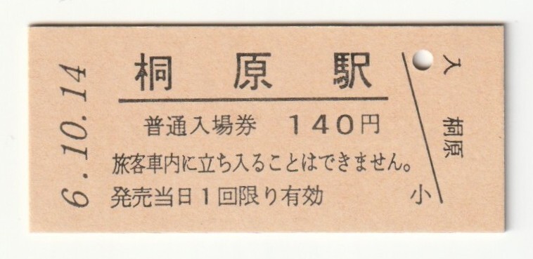 平成6年10月14日 越後線 桐原駅 140円硬券普通入場券(日付印刷)